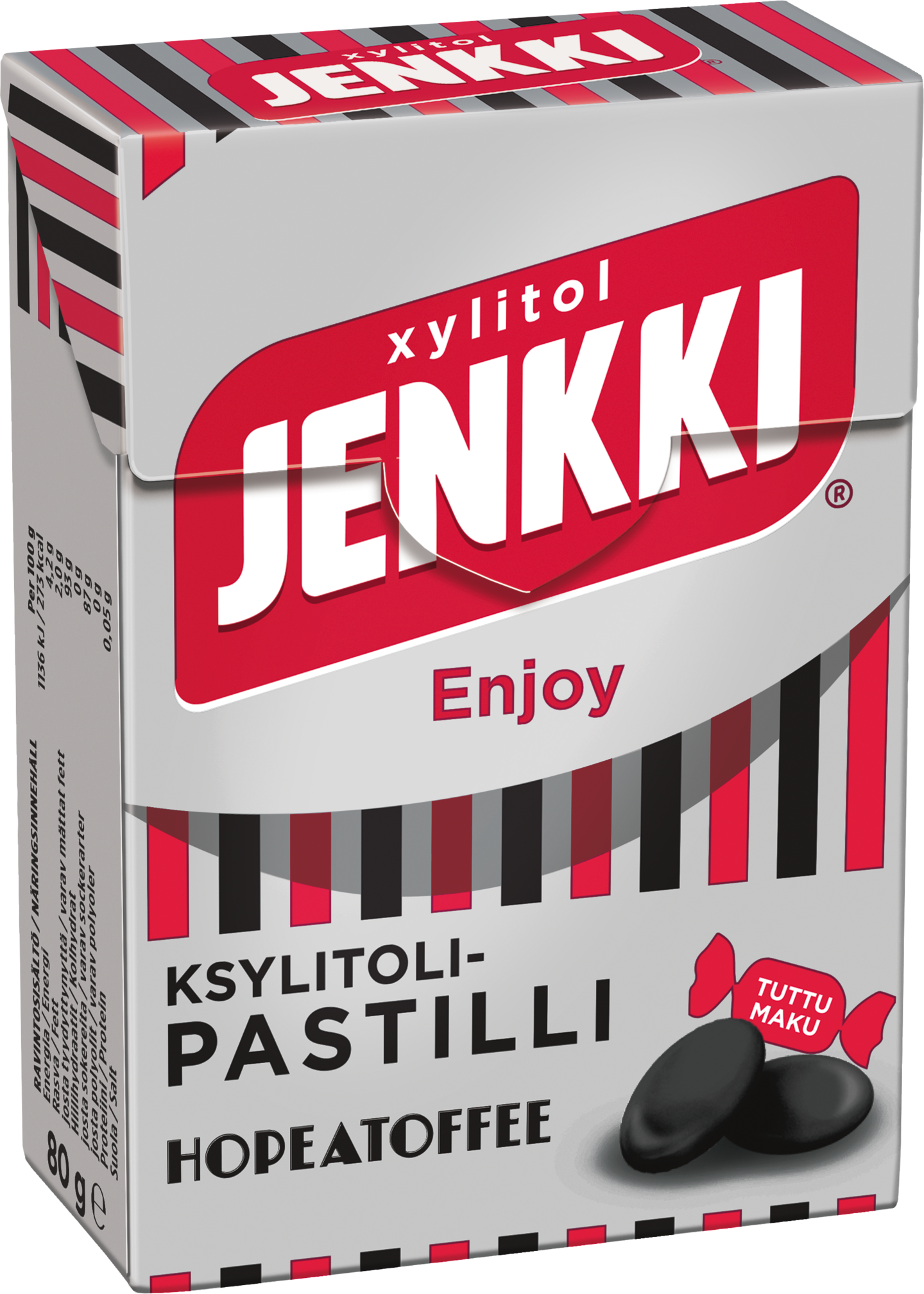 Jenkki Enjoy Hopeatoffee -ksylitolipastilli on pehmeän pureskeltava, sokeriton lakritsitoffeen makuinen pastilli, joka auttaa pitämään huolta hampaista. Hymyilyttävän hyvää hampaille, aina aterian jälkeen. Pastilleilla on Suomen Hammaslääkäriliiton suositusmerkki. Ksylitolia ja maltitolia sisältävien sokerittomien pastillien nauttiminen edistää hampaiden mineralisaation ylläpitämistä. Mineralisaatio tarkoittaa hammaskiilteen kovettumista. Ravitsemussuosituksissa suositellaan käytettäväksi ksylitolia 5 grammaa tai enemmän päivässä. Nauti kaksi Jenkki-ksylitolipastillia 3-4 kertaa päivässä. Tarkoitettu osaksi tasapainoista ja monipuolista ruokavaliota sekä terveellistä elämäntapaa