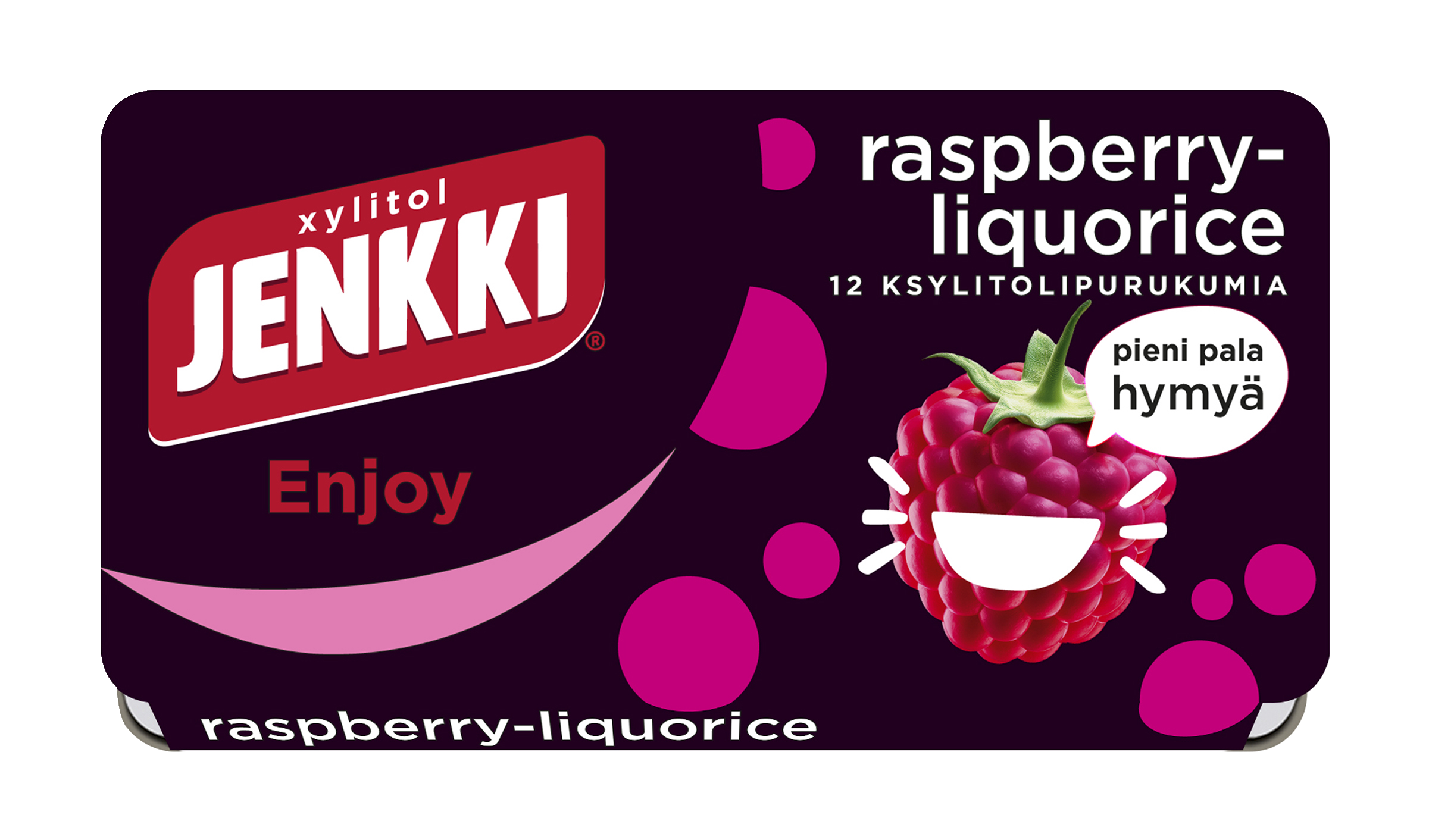Kätevä taskukokoinen pakkaus. Jenkki Enjoy Raspberry-Liquorice -ksylitolipurukumista saat yhdellä puraisulla kaksi erilaista makua. Lakritsinmakuinen sisus vadelmaisella pinnalla muodostavat yhdessä klassisen makuelämyksen. Purukumilla on Suomen Hammaslääkäriliiton suositusmerkki.
