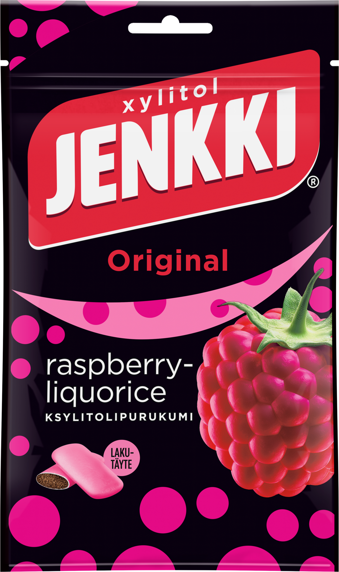 Jenkki Original Raspberry-Liquorice -ksylitolipurukumista saat yhdellä puraisulla kaksi erilaista makuelämystä. Lakritsinmakuinen ydin on päällystetty vadelmaisella raepinnalla ja ne muodostavat yhdessä jo klassikoksi muodostuneen makuelämyksen.