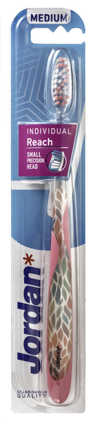 Jordan Individual Reach -harjassa yhdistyvät tuotteen käytettävyys ja kaunis pohjoismainen design. Individual Reach -harjasosa on kapea ja siinä on pidemmät kärkiharjakset, tarkempaan takahampaiden puhdistukseen. Individual Reach on saatavilla useissa eri designeissa, joista jokaisen on helppo valita mieleinen. Medium -harjaspää. Individual-hammasharjoja on saatavilla kolmessa eri koossa vastaamaan erilaisia harjaustekniikoita. Valitettavasti väriä ei voi valita verkkokaupasta tilattaessa, toimitus varastotilanteen mukaan.