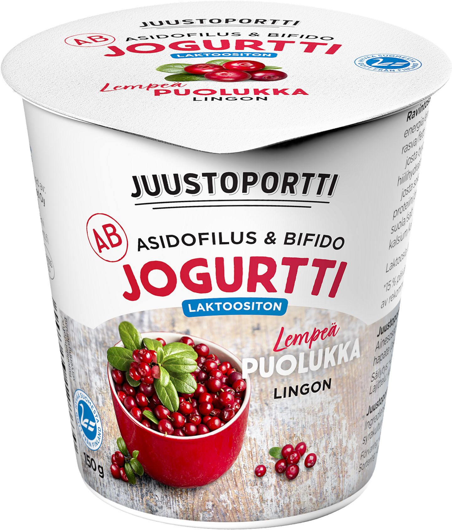 Juustoportin laktoositon puolukkajogurtti on suomalaisen puolukan ja täyteläisen AB-jogurtin lempeä liitto. Juustoportin AB-jogurtit ovat paksun samettisia, maultaan herkullisia ja ne valmistetaan suomalaisesta maidosta omassa meijerissä Jalasjärvellä. Juustoportti on suomalainen perheyritys, joka tunnetaan laadukkaista ja innovatiivisista tuotteistaan. Euroopan ensimmäisenä eläinten hyvinvointia mittaavan Welfare Quality® -sertifikaatin saanut Juustoportti on luonut joka kuukausi yhden uuden, pysyvän työpaikan jo yli 30 vuoden ajan.