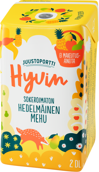 HYVIN sokeroimaton ja makeutusaineeton pillimehu miellyttää niin lapsia, kuin vähän vanhempiakin. Pakkauksessa paperipilli, jolla mehusta voi nauttia viimeistä pisaraa myöten. Mehut valmistetaan Juustoportilla Jalasjärvellä.