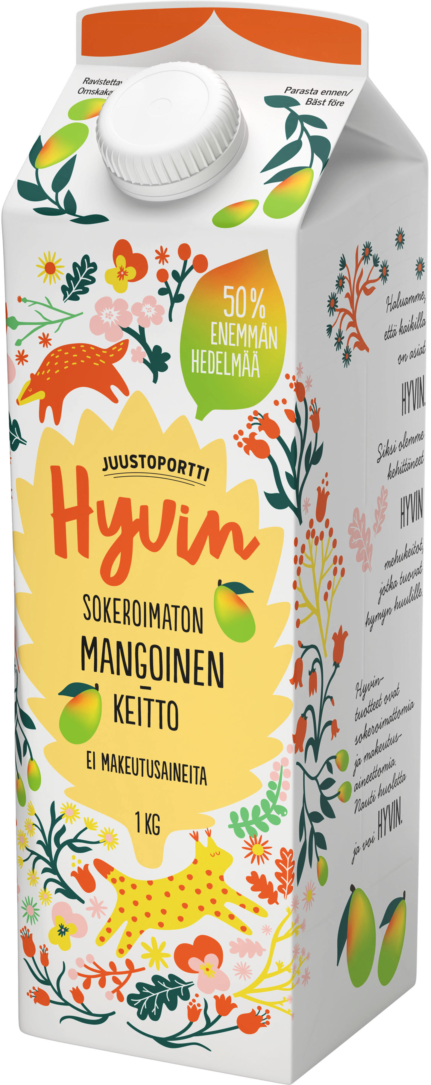 VegaaninenJuustoportti Hyvin mehukeitto on sokeroimatonta, eikä siihen lisätä makeutusaineita. Ihanan mangoinen mehukeitto sopii koko perheen välipalaksi, sillä Hyvin-mehukeiton sokeri tulee vain hedelmistä. Hyvin-mehukeitot valmistetaan omassa perhemeijerissä Jalasjärvellä.
