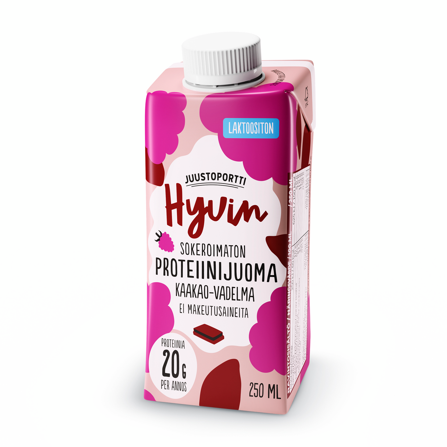 LaktoositonJuustoportin Hyvin proteiinijuomat ovat aidosti sokeroimattomia ja makeutusaineettomia. Herkullinen maku syntyy kaakaosta ja vadelmasta. Hyvin proteiinijuomissa 20 grammaa proteiinia per annos ja hiilihydraatteja vain 4,7 g/ 100 g. Juomat kulkevat kätevästi mukana ja siksi ne ovat helppoja välipaloja kotona, treenien jälkeen, töissä tai muilla retkillä. Proteiinijuomat säilyvät avaamattomana huoneenlämmössä, mutta maistuvat parhaiten kylmänä.