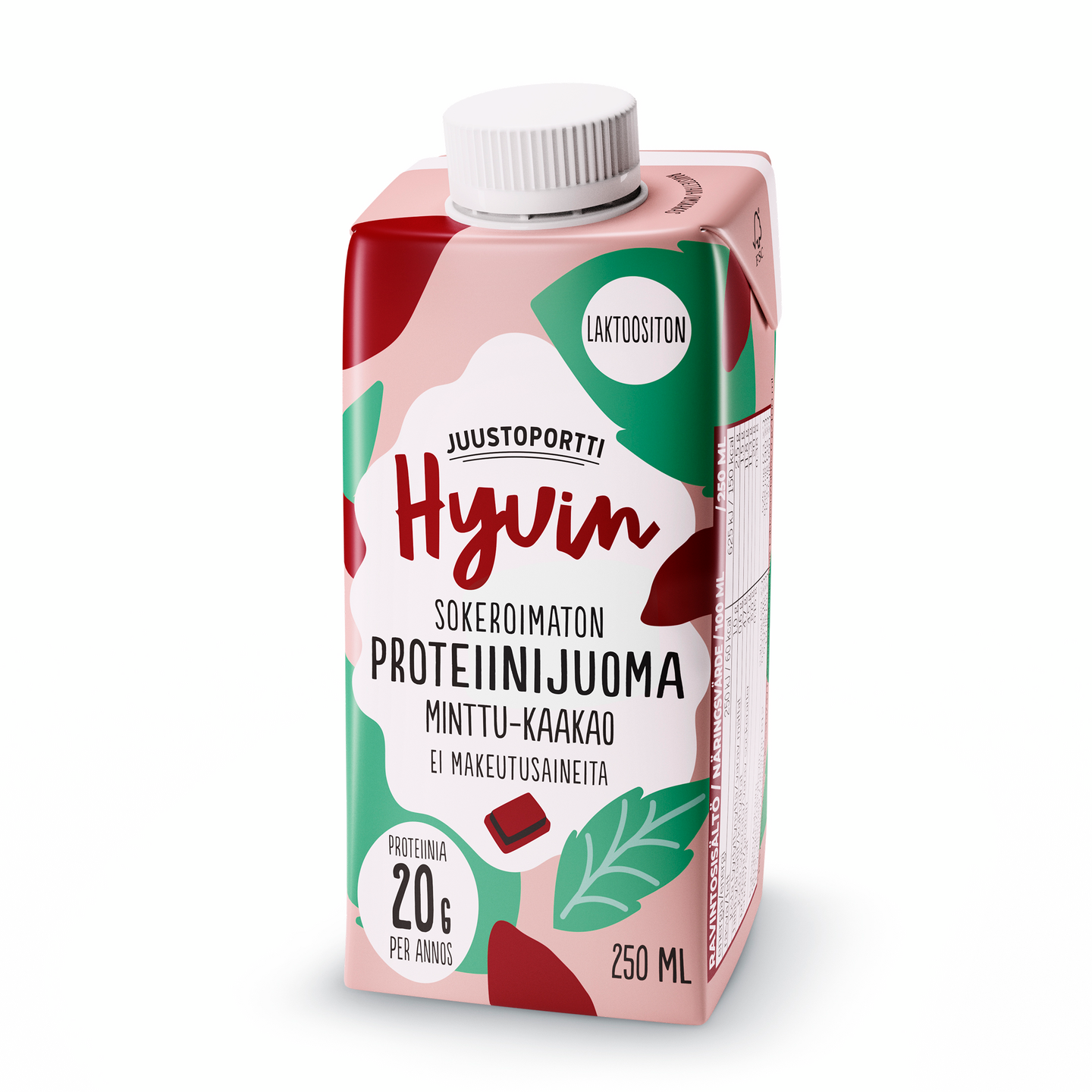 LaktoositonJuustoportin Hyvin proteiinijuomat ovat aidosti sokeroimattomia ja makeutusaineettomia. Herkullinen kaakao ja raikas minttusuklaa muodostavat raikkaan makuparin. Hyvin proteiinijuomissa 20 grammaa proteiinia per annos ja hiilihydraatteja vain 4,7 g/ 100 g. Juomat kulkevat kätevästi mukana ja siksi ne ovat helppoja välipaloja kotona, treenien jälkeen, töissä tai muilla retkillä. Proteiinijuomat säilyvät avaamattomana huoneenlämmössä, mutta maistuvat parhaiten kylmänä.
