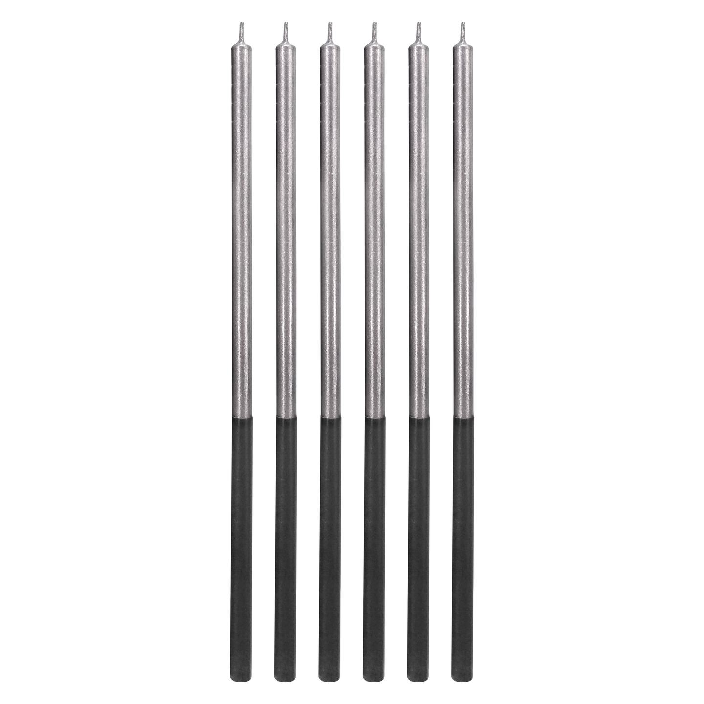 Hopeanväriset kakkukynttilät sopii koristamaan juhlakakkua. Kynttilöiden koko on 14,5 cm ja pakkaus sisältää 6 kynttilää.