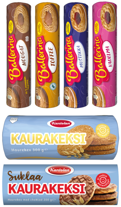 Laatikko täynnä suosittuja klassikoita! Kantolan Kaurakeksit ja suklaa Kaurakeksit sopivat herkuteltaviksi sellaisenaan, ja Kaurakeksit soveltuvat myös erinomaisesti leivontaan tai jälkiruokiin. Kokeile juustokakkujen pohjaksi tai murennettuna jäätelön tai muun herkun päälle. Kantolan Ballerina on pyöreä täytekeksi täynnä herkullista täytettä. Suloiset Ballerina-keksit ovat tuoneet palan riemua suomalaisten herkkupöytiin ja juhlahetkiin jo vuosikymmenien ajan. Kahdenkymmenen keksipaketin sekalaatikossa tuotteita seuraavasti: