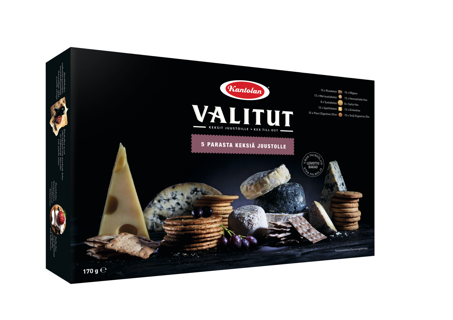 VegaaninenTähän pakkaukseen olemme keränneet Kantolan-sarjan parhaimpia keksejä, jotka on suunniteltu eri juustojen kanssa nautittavaksi. Yhdistele keksejä mielesi mukaan mietojen, pehmeiden tai kovien suosikkijuustojesi, sekä herkullisten lisukkeiden kuten hunajan ja hillon kanssa. Pakkauksesta näet juustosuosituksiamme sekä tarjoiluehdotuksia. Yllätä ystäväsi tai ilahduta itseäsi. Palmuöljytön.