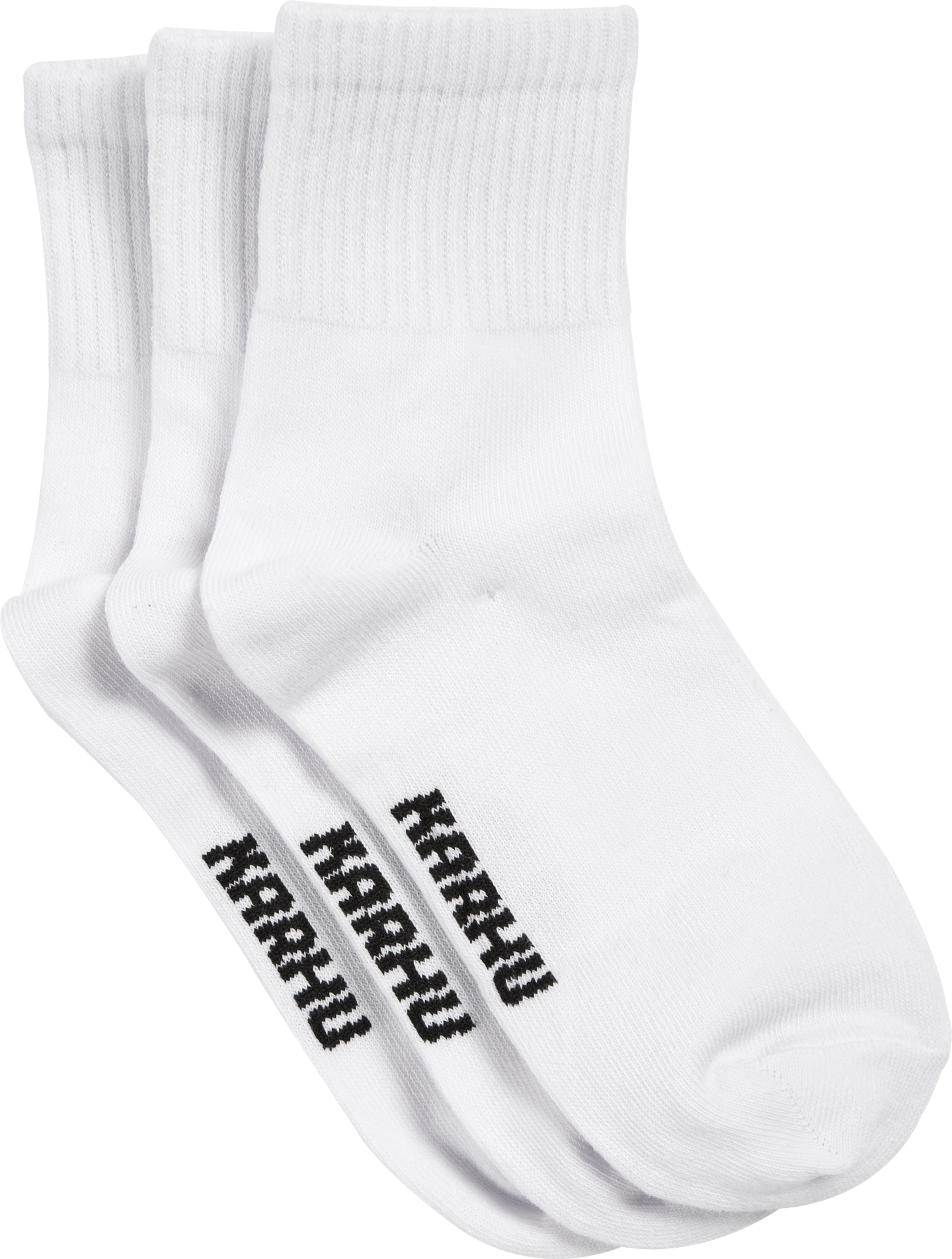 Karhu urheilusukat unisex malli. Valkoinen yksivärinen sukka ja suuri musta Karhu-teksti jalkapohjan kohdalla.
