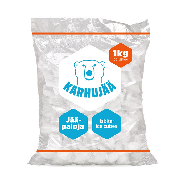 Kilo kristallinkirkkaita jääpaloja. Suuri pinta, jossa optimaalinen jäähdytysefekti. Drinkkiin, cooleriin tai ruokien säilytykseen. Tässä pussissa jääpaloja on n. 25-30 kpl, joista saat jäät n. 10 drinkkiin, Nämä jääpalat sulavat hitaammin kuin itsetehdyt, kokeile vaikka itse!