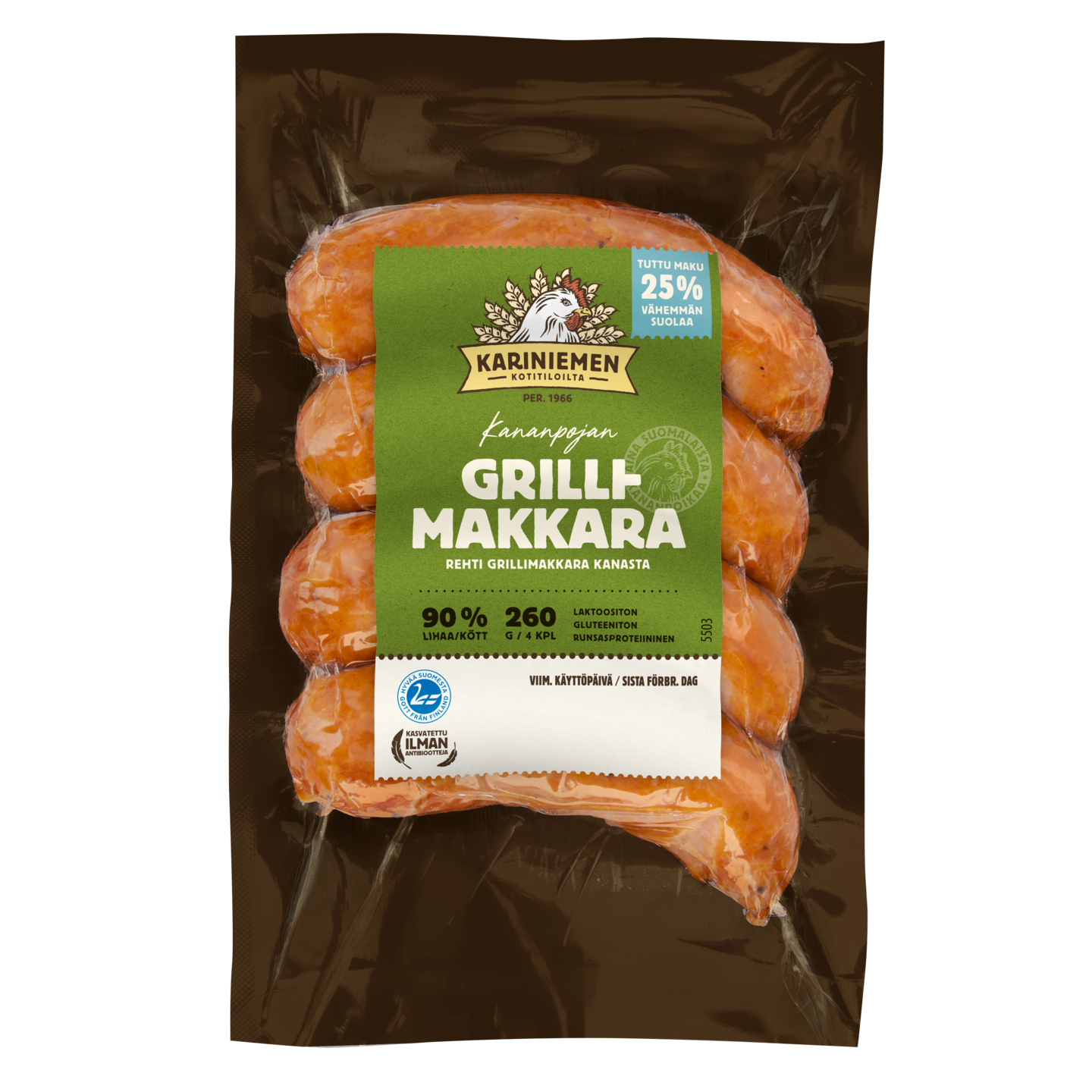 LaktoositonKariniemen grillimakkara on valmistettu suomalaisesta antibioottivapaasta kananpojasta ja lihaa siinä on peräti 90%. Se on mehevä grillimakkara, jolle makua antaa aito lihaliemi. Nauti sellaisenaan grillattuna tai valmista kanaisa makkarakeitto tai -kastike. Lajittele pakkaus käytön jälkeen muovina.