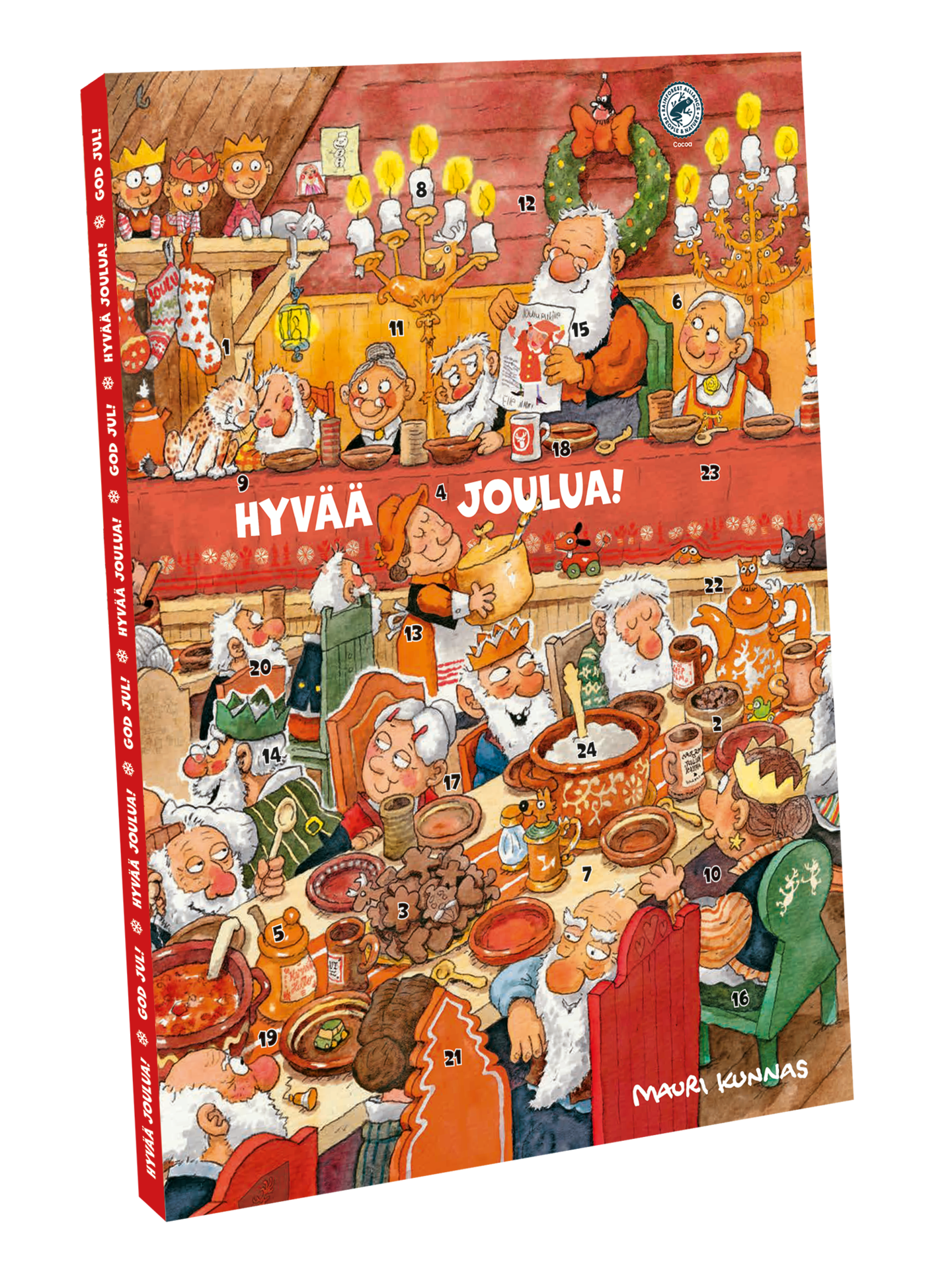 Mauri Kunnas on yksi suomalaisten ehdottomista kestosuosikeista, ja hänen huikean yksityiskohtainen kuvitustyylinsä puhuttelee niin lapsia kuin aikuisiakin. Kalenteri sisältää 24 herkullista suklaapalaa. Voit valita kahdesta hauskasta kalenterikuvituksesta sinulle mieluisan.