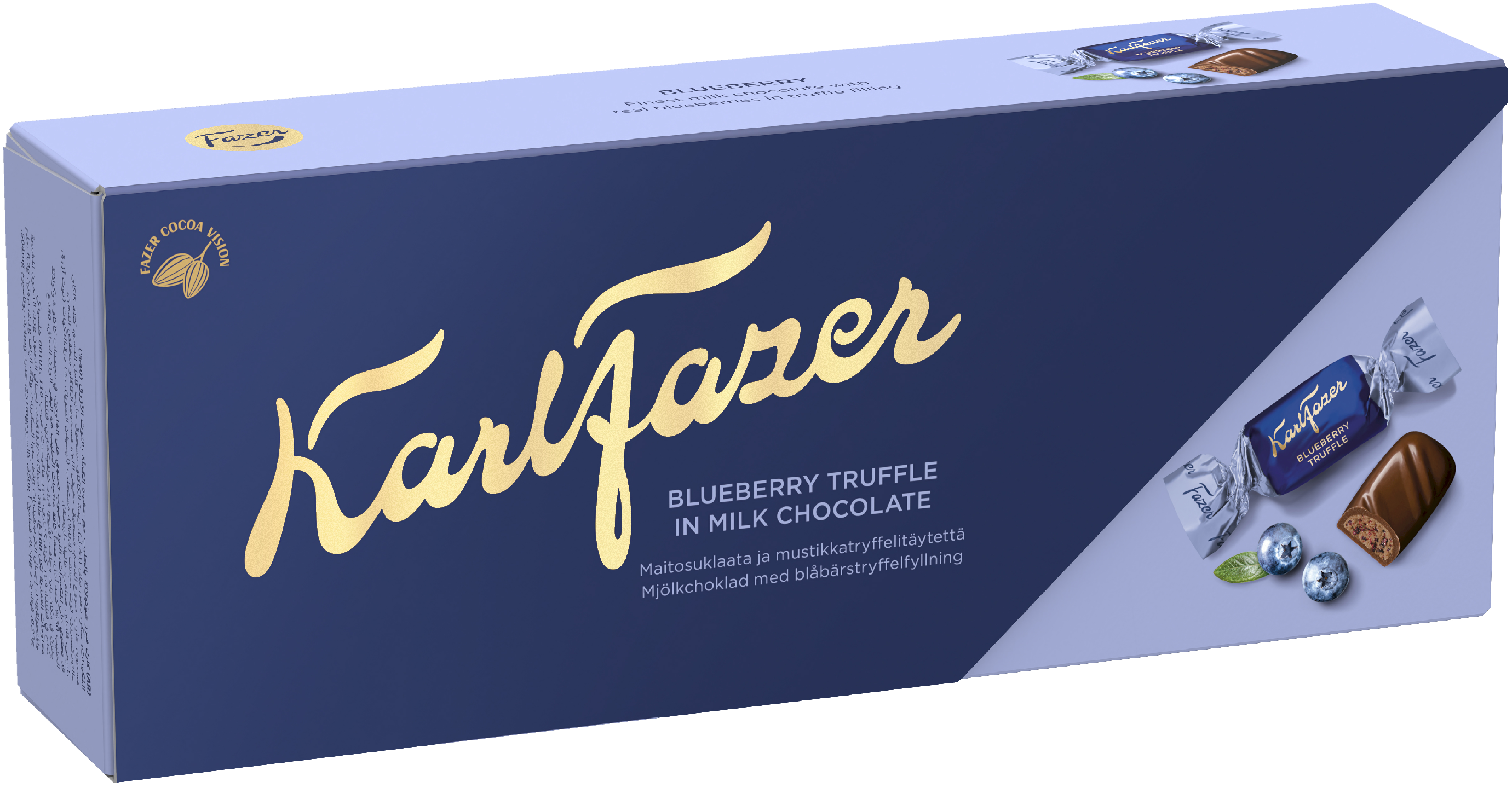 Suomen rakastetuin suklaa, jonka ainutlaatuisen täyteläisen maun ovat taanneet parhaat raaka-aineet jo vuodesta 1922 saakka. Karl Fazer Blueberry Truffle ‑konvehdit ovat täydellinen yhdistelmä Fazerin maitosuklaata ja pehmeää tryffelitäytettä, jossa on aitoja mustikanpaloja. Anna parhaisiin hetkiin sopiva rasia lahjaksi tai nautiskele ystävien kanssa. Noudatamme kaakaonhankinnassamme Fazerin kaakaovisiota. Lue lisää www.fazercocoavision.com.