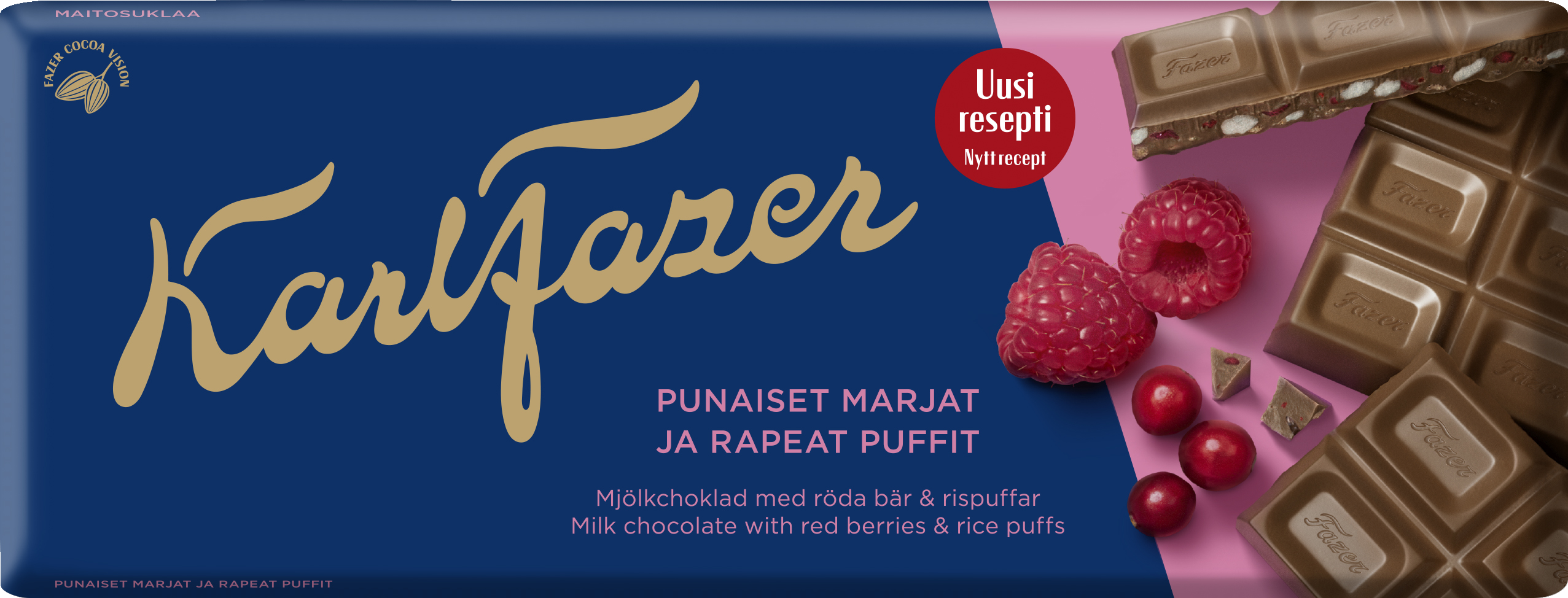 Suomen rakastetuin suklaa, jonka ainutlaatuisen täyteläisen maun ovat taanneet parhaat raaka-aineet jo vuodesta 1922. Aidosta maidosta valmistettu suklaa kietoo sisäänsä kuivattuja karpaloita, vadelmia sekä rapeita riisipuffeja. Yhdistelmä, joka saa aina hyvälle tuulelle! Jaa ylellisen kokoinen levy ystävien kanssa tai nauti palanen päivän parhaisiin hetkiin. Noudatamme kaakaonhankinnassamme Fazerin kaakaovisiota. Lue lisää www.fazercocoavision.com.
