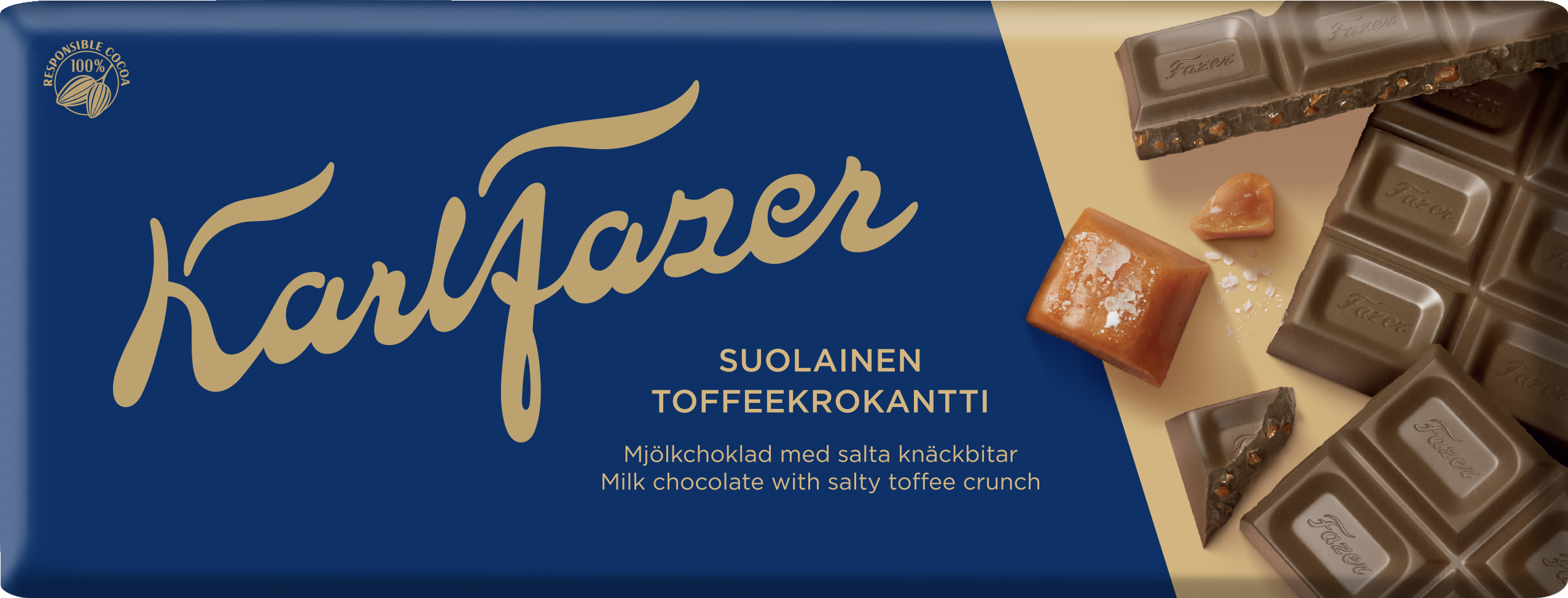 Vastustamaton yhdistelmä toisiaan täydentävää makeaa ja suolaista: pehmeää Karl Fazer -maitosuklaata, rapeaa toffeekrokanttia ja ripaus suolaa. Suomen rakastetuin suklaa, jonka ainutlaatuisen täyteläisen maun ovat taanneet parhaat raaka-aineet jo vuodesta 1922 saakka. Noudatamme kaakaonhankinnassamme Fazerin kaakaovisiota. Lue lisää www.fazercocoavision.com. Jaa suklaalevy ystävien kanssa tai anna itsellesi herkullinen hetki.