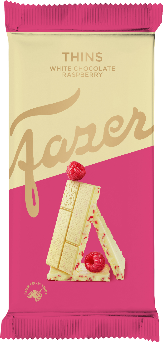 Karl Fazer Thins on herkullinen valkosuklaata ja vadelmaa sisältävä levy. Suomen rakastetuin suklaa, jonka ainutlaatuisen täyteläisen maun ovat taanneet parhaat raaka-aineet jo vuodesta 1922 saakka.