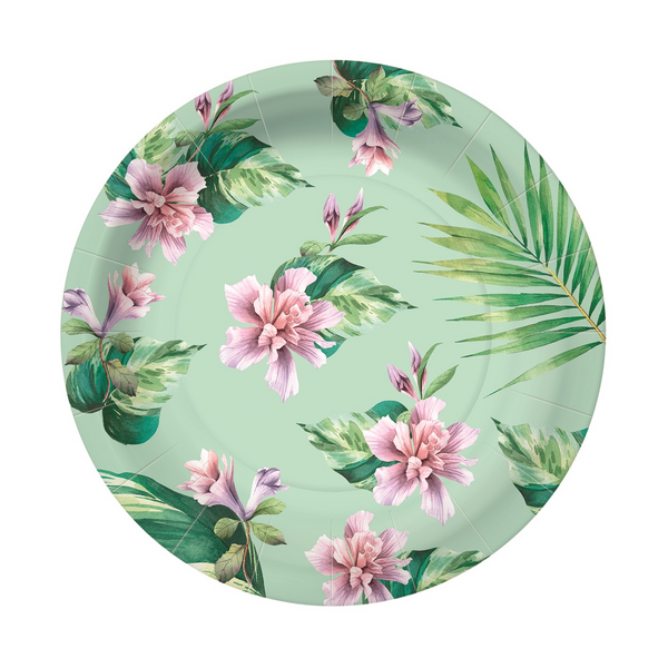 Vaaleanvihreä kartonkilautanen kukka kuviolla. Lautasen koko n. 23 cm ja paketissa 10 kpl.