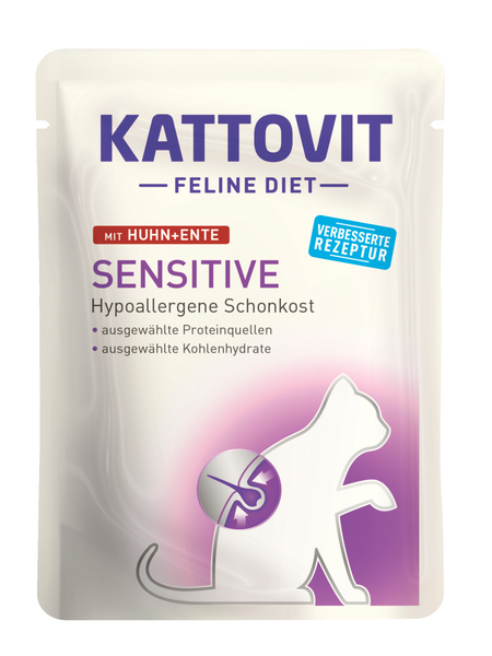 Erikoisravinto kissoille intoleranssioireisiin, valikoidut proteiinilähteet, ei nautaa eikä sianlihaa, gluteeniton. Täysrehu kissoille. Kattovit Sensitive on eri ravintoaineiden aiheuttamista yliherkkyysoireista kärsiville kissoille. Allergia ja intoleranssi ovat yleisiä ongelmia, ja niistä on usein seurauksena epämiellyttäviä iho-, turkki- ja suolisto-ongelmia. Ongelmien taustalla ovat usein tietyt proteiinilähteet, mutta myös erilaiset viljat. Kattovit Sensitivessä ei ole sian- tai naudanlihaa, vehnää tai muita gluteenipitoisia viljoja. Siipikarja ja kananmuna ovat erittäin hyvin sulavia ja vatsalle ystävällisiä energialähteitä. Hyvin imeytyvinä hiilihydraattilähteinä on käytetty riisiä. Tauriini, vitamiinit ja kivennäisaineet viimeistelevät tasapainoiset ravintoaineet.