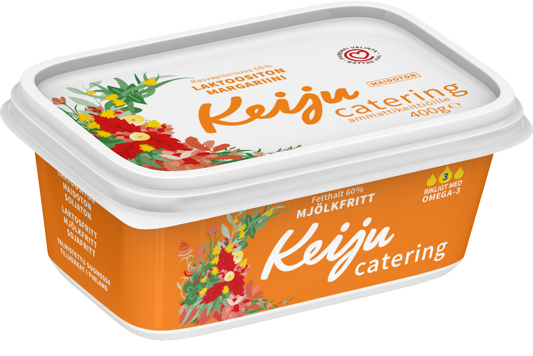 VegaaninenKeiju Catering Margariini 60 400 g on maidoton ja laktoositon maukas yleislevite joka sopii hyvin lähes kaikille ruokavalioille. Tuote on rasvahappokoostumukseltaan ravitsemussuositusten mukainen ja kokonaan kasvipohjainen, ja sopii siksi hienosti myös vegaaniseen ruokavalioon. Sopii erinomaisesti levitteeksi, mutta myös kaikenlaiseen ruoanlaittoon sekä leivontaan. Valmistettu Suomessa.