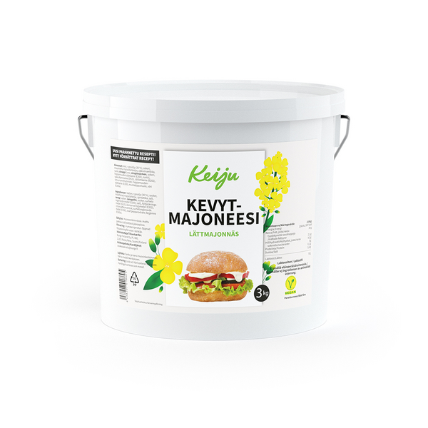 VegaaninenKeiju Kevytmajoneesi on vegaaniseen ruokavalioon sopiva, maistuva majoneesi, jota voi itse muunnella käyttötarkoituksen mukaan. Sopii erinomaisesti kaikenlaisiin hampurilaisiin, wrappeihin ja dippeihin. Tarjoile sellaisenaan tai mausta erilaisilla mausteilla ja yrteillä.