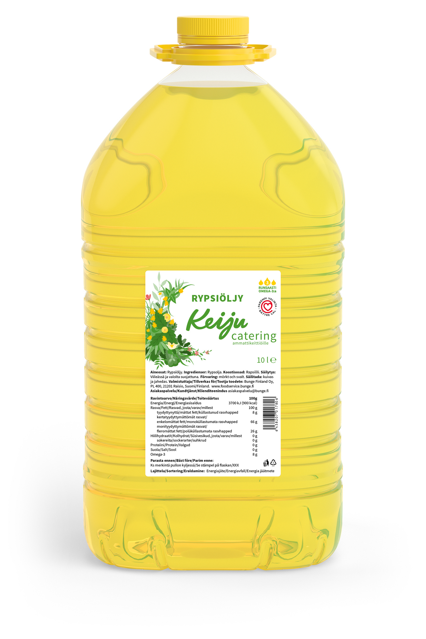 VegaaninenKeiju Catering Rypsiöljy on joka ammattikeittiön yleisöljy joka sopii moneen ruoanlaittoon ja leivontaan. Tuote on pakattu 63 % perinteistä kanisteria vähemmän muovia sisältävään PET kannuun.