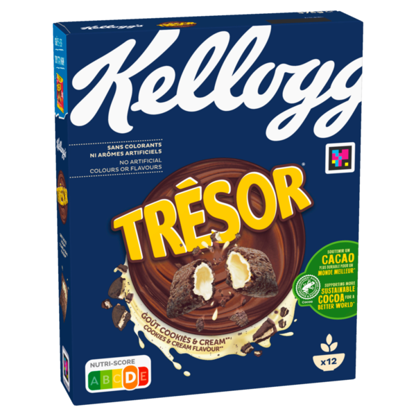 Aloita päiväsi energisesti ja nauti suussa sulavista Kellogg's Tresor Cookies & Cream -muroista! Pakkauksen sisältä paljastuu täydellisen rapsakoita kaakaomurotyynyjä, jotka on täytetty herkullisella kermatäytteellä. Näistä muroista saat maistuvan startin aamuun, ja ne toimivat myös loistavana välipalana. Vitamiineilla vahvistetut Tresor-murot tekevät arjestasi entistäkin herkullisempaa!