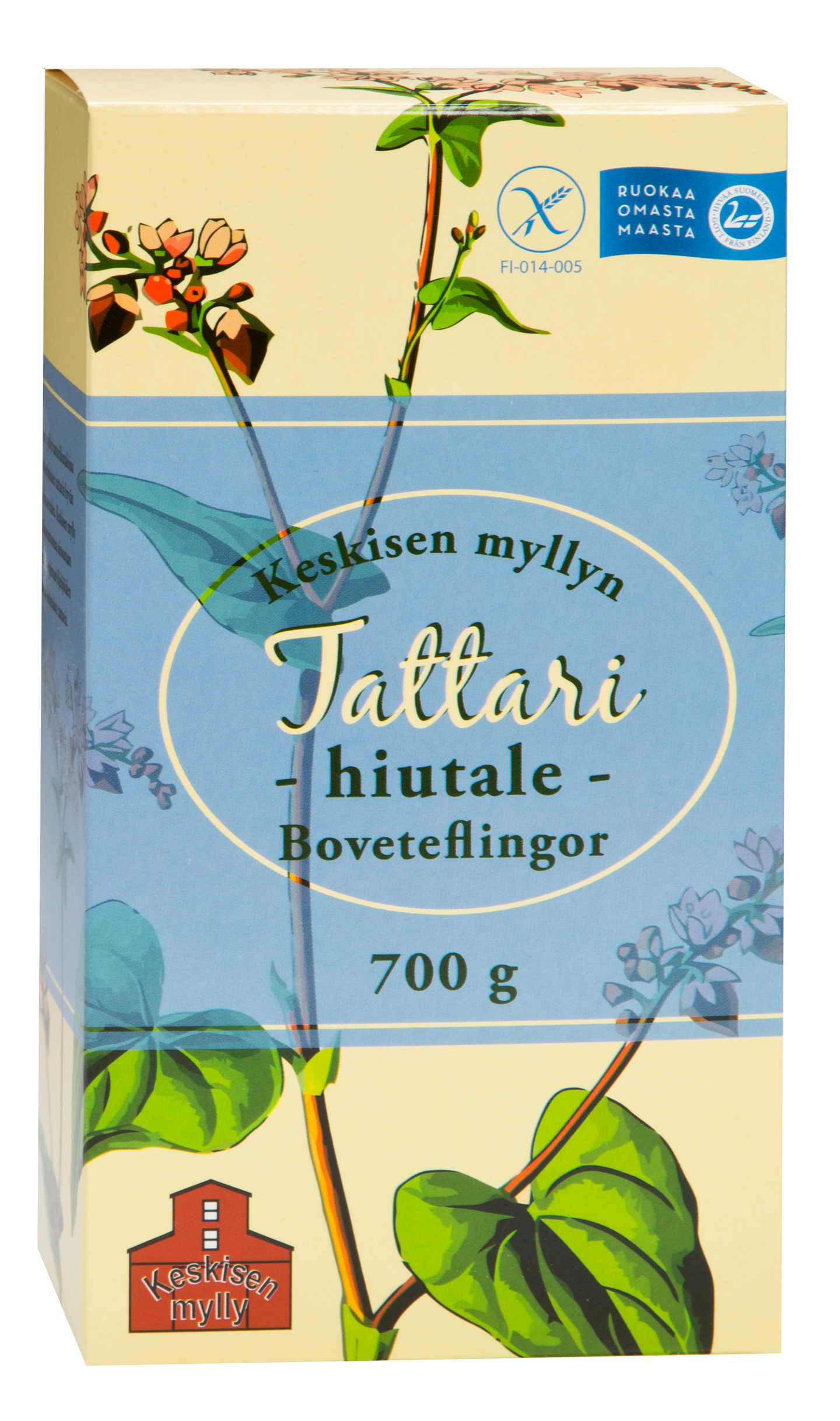 GluteenitonKeskisen Myllyn tattarihiutaleissa maistat kotimaisen tattarin hyvän maun ja tuoreuden. Keskisen Mylly käyttää tuotantoonsa ainoastaan valvottujen sopimusviljelijöiden tuottamaa kotimaista tattaria. Keskisen Myllyn tattarihiutaleet ovat hiutalekoneella litistettyä tattaria. Hiutale kypsyy nopeammin kuin rouhe tai