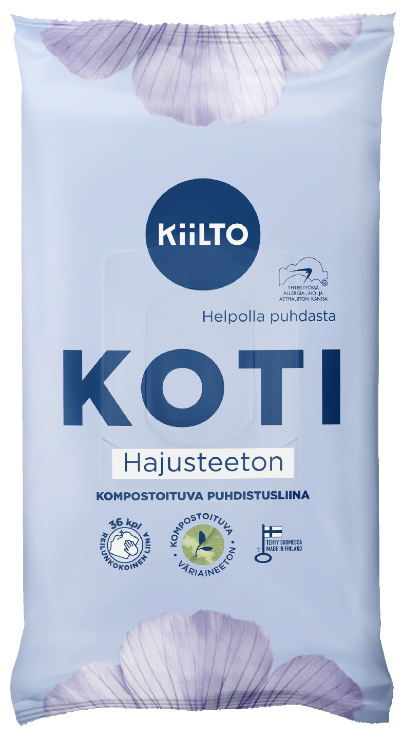 Kotimainen käyttövalmis Kiilto Koti yleispuhdistusliina Hajusteeton puhdistaa helposti ja tehokkaasti pölyn ja tahrat kaikilta kosteaa pyyhkimistä kestäviltä kovilta pinnoilta. Ympäristöystävälliset, kompostoituvat liinat on pakattu kierrätettävään muoviin. Tuotteella on Allergia-, Iho- ja Astmaliiton Allergiatunnus.