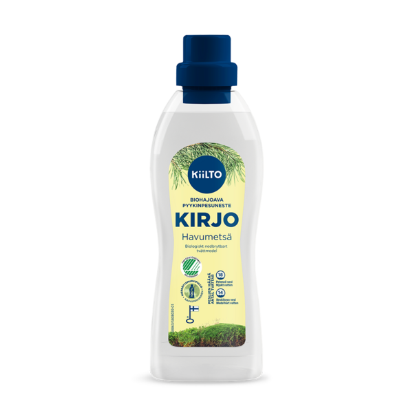 Kotimainen, 100 % biohajoava Kiilto Kirjo pyykinpesuneste Havumetsä pesee vaatteet tehokkaasti jo 30 asteen lämpötilasta aina 95 asteeseen asti. Soveltuu käsin- ja konepesuun sekä tahranpoistajana suoraan tekstiilille pitäen värit kirkkaina. Suomalaisen luonnon inspiroima mieto havumetsän tuoksu tekee pyykinpesusta miellyttävää. Tuotteen 100 % helposti biohajoava jayli 90 % kasviperäinen koostumus sekä 100 % kierrätysmuovista valmistettu, uudelleen kierrätettävä pullo minimoivat pyykinpesun ympäristökuormituksen. Tuotteelle myönnetty Joutsenmerkki takaa, että tuotteen ympäristövaikutukset on arvioitu, tuote on käyttäjälleen turvallinen ja tutkitusti tehokas. Väriaineeton ja vegaaninen. Ei sovellu villalle ja silkille.