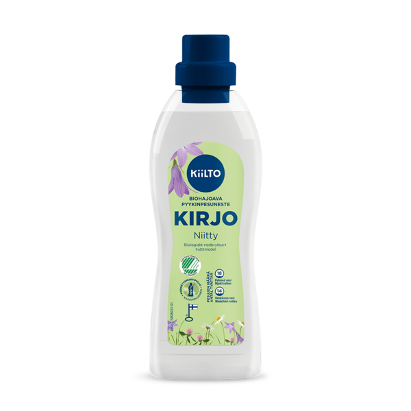 Kotimainen, 100 % biohajoava Kiilto Kirjo pyykinpesuneste Niitty pesee vaatteet tehokkaasti jo 30 asteen lämpötilassa aina 95 asteeseen asti. Soveltuu käsin- ja konepesuun sekä tahranpoistajana suoraan tekstiilille pitäen värit kirkkaina. Suomalaisen luonnon inspiroima mieto keväisen Niityn tuoksu tekee pyykinpesusta miellyttävää. Tuotteen 100 % helposti biohajoava ja yli 90 % kasviperäinen koostumus sekä 100 % kierrätysmuovista valmistettu, uudelleen kierrätettävä pullo minimoivat pyykinpesun ympäristökuormituksen. Tuotteelle myönnetty Joutsenmerkki takaa, että tuotteen ympäristövaikutukset on arvioitu, tuote on käyttäjälleen turvallinen ja tutkitusti tehokas. Väriaineeton ja vegaaninen. Ei sovellu villalle ja silkille.