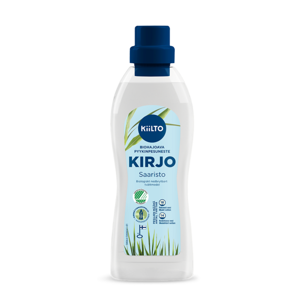 Kotimainen, 100 % biohajoava Kiilto Kirjo pyykinpesuneste Saaristo pesee vaatteet tehokkaasti jo 30 asteen lämpötilassa aina 95 asteeseen asti. Soveltuu käsin- ja konepesuun sekä tahranpoistajana suoraan tekstiilille pitäen värit kirkkaina. Suomalaisen luonnon inspiroima mieto saariston tuoksu tekee pyykinpesusta miellyttävää. Tuotteen 100 % helposti biohajoava ja yli 90 % kasviperäinen koostumus sekä 100 % kierrätysmuovista valmistettu, uudelleen kierrätettävä pullo minimoivat pyykinpesun ympäristökuormituksen. Tuotteelle myönnetty Joutsenmerkki takaa, että tuotteen ympäristövaikutukset on arvioitu, tuote on käyttäjälleen turvallinen ja tutkitusti tehokas. Väriaineeton ja vegaaninen. Ei sovellu villalle ja silkille.