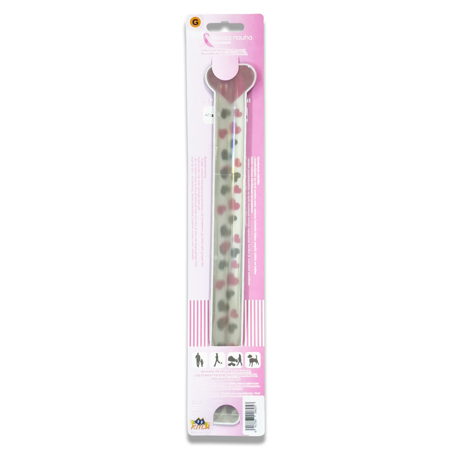 Kotimainen jousiheijastin. Ostamalla tämän tuotteen tuet Roosa nauha -keräystä 0,50 eurolla. 3M Scotchlite heijastinmateriaali. EN 13356 hyväksytty. Kiinnitys kiepauttamalla.