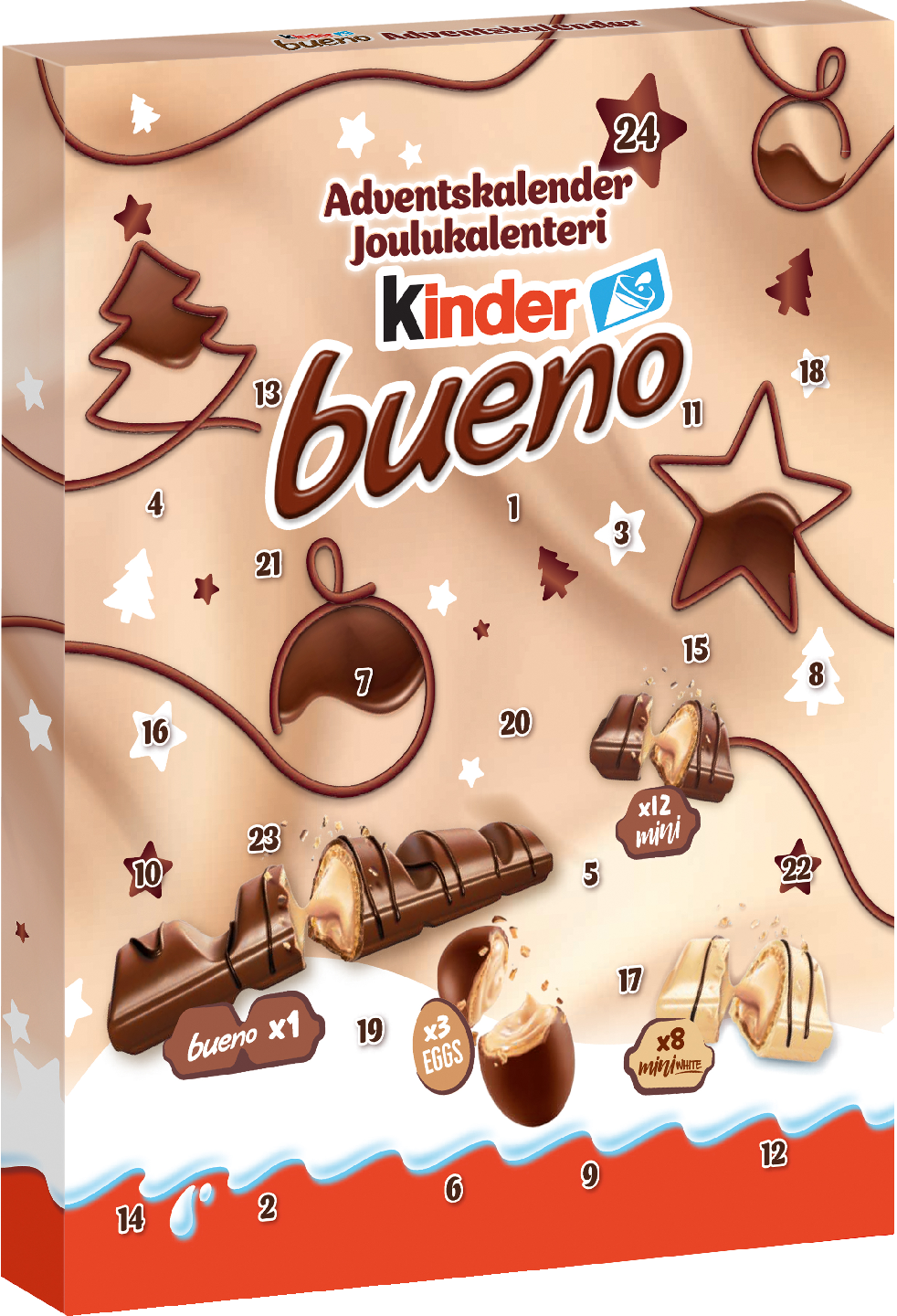 Kinder Bueno-suklaajoulukalenteri 181g juhlistaa joulun lähtölaskennan herkullisen Kinder Bueno-suklaan kera. Nauti joka päivä ennen joulua herkullinen Kinder Bueno-yllätysherkku pehmeän hasselpähkinätäytteen ja rapean vohvelin kera - päällä samettista maitosuklaata.
