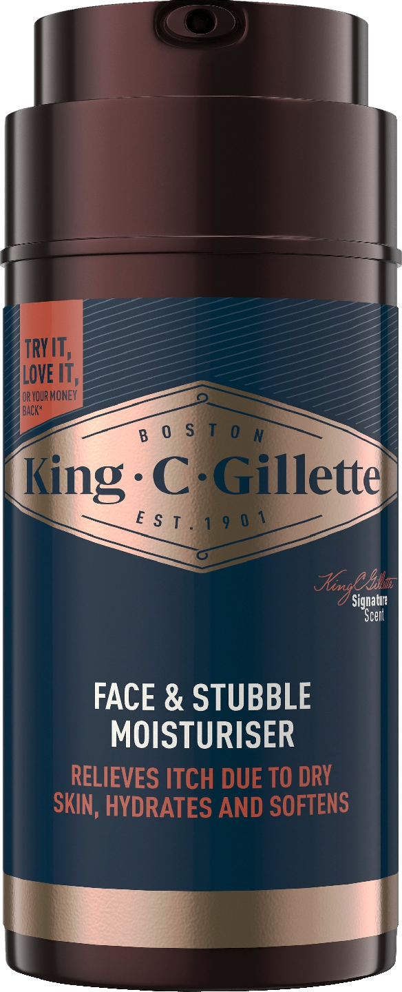 King C. Gillette -kosteusvoide kasvoille ja sängelle on kaksitehoinen kosteusvoide. Se hoitaa ja tarjoaa pitkäkestoisen kosteutuksen ylläpitäen ihon luonnollista kosteussuojaa sekä pehmentäen ja silottaen karheaa ja pistelevää sänkeä. Kosteusvoiteessa on Gilletten tunnusomainen bergamotin, kurjenpolven ja seetrin tuoksu. Pumppaa pieni määrä tuotetta kämmenellesi ja levitä kasvoille sekä sänkeen. Käytä päivittäin, jotta saat terveen näköisen ihon ja silminnähden vähemmän ihoärsytystä ja punoitusta.