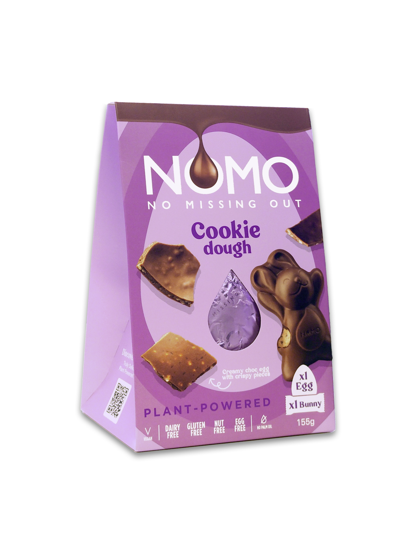 VegaaninenHerkullinen vegaaninen maitosuklaamuna ja Cookie Dough pupu. NOMO-tuotteet eivät sisällä maitoa, gluteenia, kananmunaa eikä pähkinää.