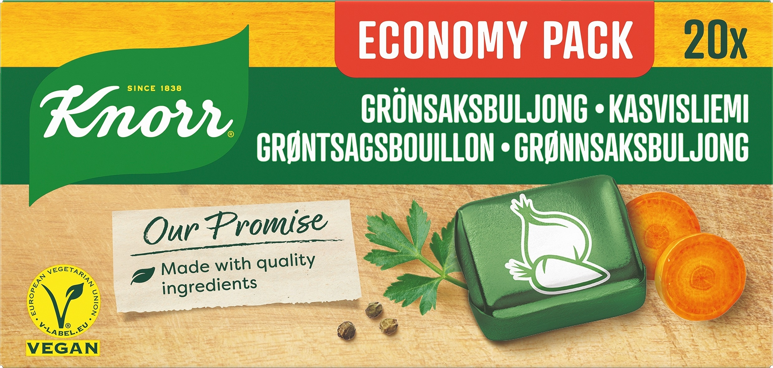 Knorr kasvisliemi on täydellinen arjen apuri. Knorr Liemikuutio Kasvis sopii kasvisruokiin, kastikepohjiin sekä erilaisiin keittoihin. Kokeile kasvisliemikuutioita myös risoton ja pastojen kanssa. Knorr Liemikuutiot antavat makua jokaiselle aterialle. Pakkaus sisältää 20 kuutiota ja yhdestä kuutiosta valmistuu 0,5l valmista lientä. Vastuullisesti viljellyt kasvikset, yrtit ja mausteet. 100% luonnollisia ainesosia.