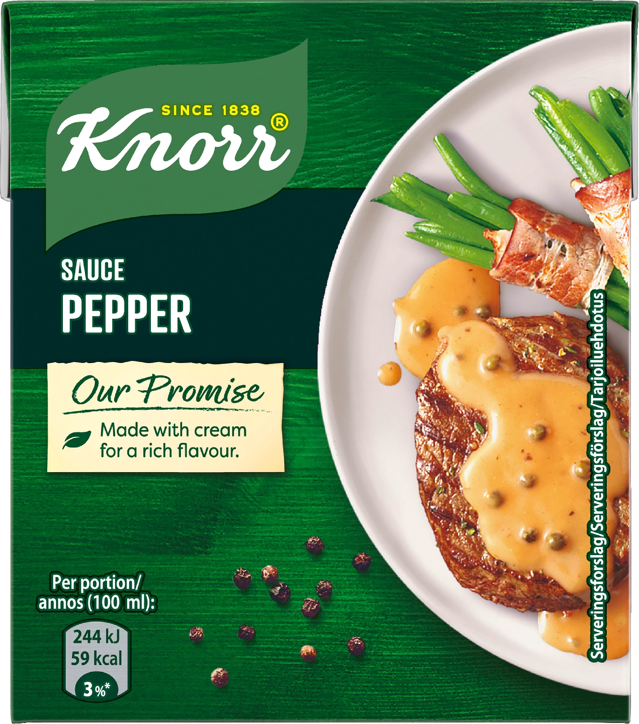 Knorr Pippuri kruunaa ateriasi. Sen herkullinen aromi syntyy mustapippurista sekä brandystä. Lohkoperunat, lehtipihvi ja pippurikastike on kaikkien tuntema klassikko. Pippurikastike on täydellinen kastike pihville, mutta toimii erinomaisesti myös muiden liharuokien kumppanina. Varsinainen perinneruoka ja juhlapöydän herkku on tietenkin paahtopaisti pippurikastikkeella. Knorr Ppippuri sisältää 100 % luonnollisia ainesosia. Knorrin kastikkeet ovat jokaisen kokin pieni salaisuus, joka saa ruoan maistumaan herkulliselta käden käänteessä. Monipuolisesta valikoimastamme löydät aina oikean Knorr-kastikkeen, joka täydentää ruokasi ainutlaatuista makua. Pippurikastikkeen lisäksi sinun kannattaa tutustua myös muihin kastikkeisiimme, kuten esimerkiksi Knorr Béarnaisekastike ja Knorr Hollandaisekastike. Kaikki kastikkeet valmistuvat helposti ja nopeasti. Ei lisättyä sokeria. Laadukas ja maukas ruoka on intohimomme! Siksi Knorr pyrkii aina kehittämään uusia jännittäviä ruokatuotteita, jotka tekevät ruokailukokemuksestasi erityisen maistuvan. Yksi vahvimmista puolistamme on laaja tuntemus paikallisista ruokaperinteistä – huolimatta siitä, että olemme niin suuri kansainvälinen brändi. Meitä ohjaa rakkaus ruokaan. Olemme tehneet Knorrilla vuosikymmenten ajan työtä luodaksemme korkealaatuisia tuotteita, jotka valmistetaan parhaista raaka-aineista. Haluamme auttaa sinua valmistamaan hyvää, yksinkertaista ja terveellistä ruokaa, jossa on runsaasti makua. Intohimo laadukkaaseen ja maukkaaseen ruokaan vie meidät tulevaisuuteen, joka huomioi paremmin yhteiskuntamme ja ympäristömme. Tulevaisuuteen, jossa kaikki raaka-aineemme vihanneksista alkaen ovat kestävästi tuotettuja. Me Knorrilla haluamme uudistaa ruokailutottumuksia, mutta emme voi tehdä sitä yksin. Kutsumme sinut mukaan! Rakennetaan yhdessä vihreämpää tulevaisuutta. Vieraile verkkosivuillamme knorr.com/fi nähdäksesi tuotteemme ja reseptimme. Tutustu kaikkeen siihen, mikä meitä inspiroi kestävän tulevaisuuden luomiseen.