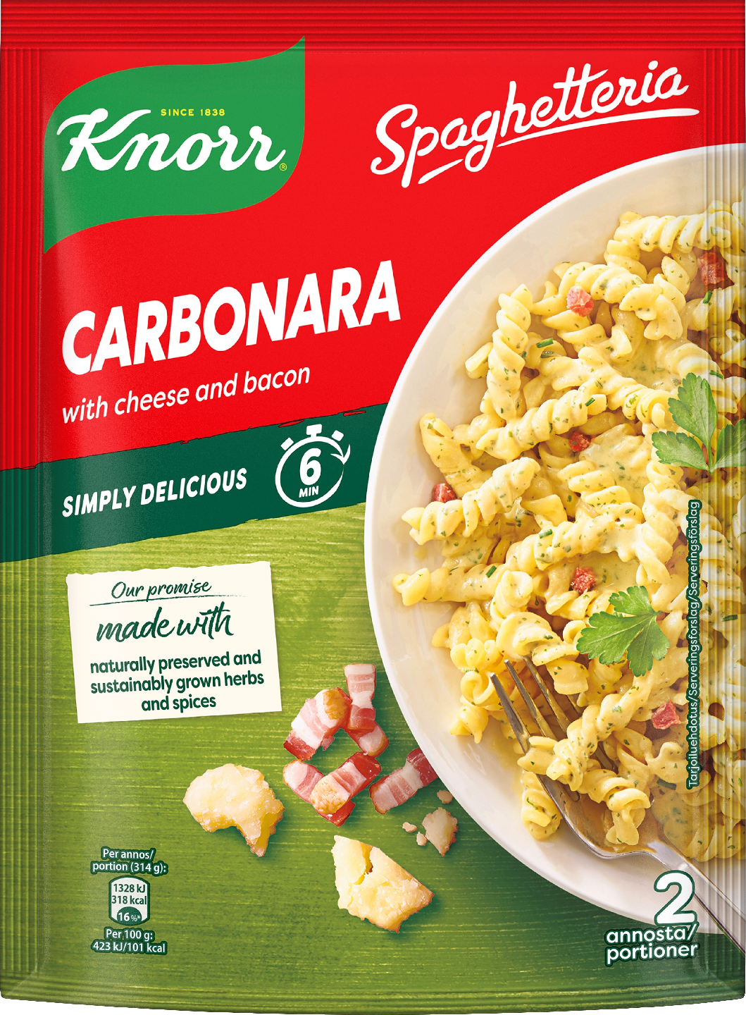 Knorr Spaghetteria Carbonara on maistuva, herkullinen pasta-ateria, jonka valmistus ei juuri aikaa vie. Kermainen pekonipasta: juustoa ja pekonia – valmista jo 6 minuutissa. Täydellinen valinta lapsiperheen usein kiireiseen päivään. Knorr Spaghetteria Carbonaran valmistuksessa käytetään kestävästi kasvatettuja yrttejä ja mausteita. Ateria-aines valmistetaan täysin ilman lisäaineita. Knorrin monipuolisesta Spaghetteria-valikoimasta löytyy suosikki jokaiseen makuun. Näin helposti valmistat pasta carbonaran: Kiehauta vesi kattilassa, lisää pussin sisältö, hauduta ja sekoita. Ruoka on valmis nautittaksi muutamassa minuutissa. Knorr Spaghetteria Carbonara -ateriasta riittää kahdelle. Käden käänteessä syntyvä kermainen pekonipasta sopii täydellisesti yksinkertaiseksi arkiruoaksi. Knorrin pekonipasta on kätevä vaihtoehto myös silloin, kun sinun pitää valmistaa nälkäiselle nuorelle nopea ateria. Me olemme Knorrilla sitä mieltä, että myös yksinkertaisen ja nopeasti valmistuvan ruoan tulee maistua hyvältä. Laadukas ja maukas ruoka on intohimomme. Siksi me pyrimme aina kehittämään uusia jännittäviä ruokatuotteita, jotka tekevät ruokailukokemuksestasi erityisen maistuvan. Yksi vahvimmista puolistamme on laaja tuntemus paikallisista ruokaperinteistä. Meitä ohjaa rakkaus ruokaan. Haluamme auttaa sinua valmistamaan hyvää, yksinkertaista ja terveellistä ruokaa, jossa on runsaasti makua. Juuri intohimomme laadukkaaseen ja maukkaaseen ruokaan on johtotähtemme. Se vie meidät tulevaisuuteen, joka huomioi paremmin yhteiskuntamme ja ympäristömme. Tulevaisuuteen, jossa kaikki raaka-aineemme vihanneksista alkaen ovat kestävästi tuotettuja. Me Knorrilla haluamme uudistaa ruokailutottumuksia, mutta emme voi tehdä sitä yksin. Siksi kutsumme sinut mukaan. Rakennetaan yhdessä vihreämpää tulevaisuutta. Vieraile verkkosivuillamme knorr.com/fi nähdäksesi tuotteemme ja reseptimme. Tutustu kaikkeen siihen, mikä meitä inspiroi kestävän tulevaisuuden luomiseen.