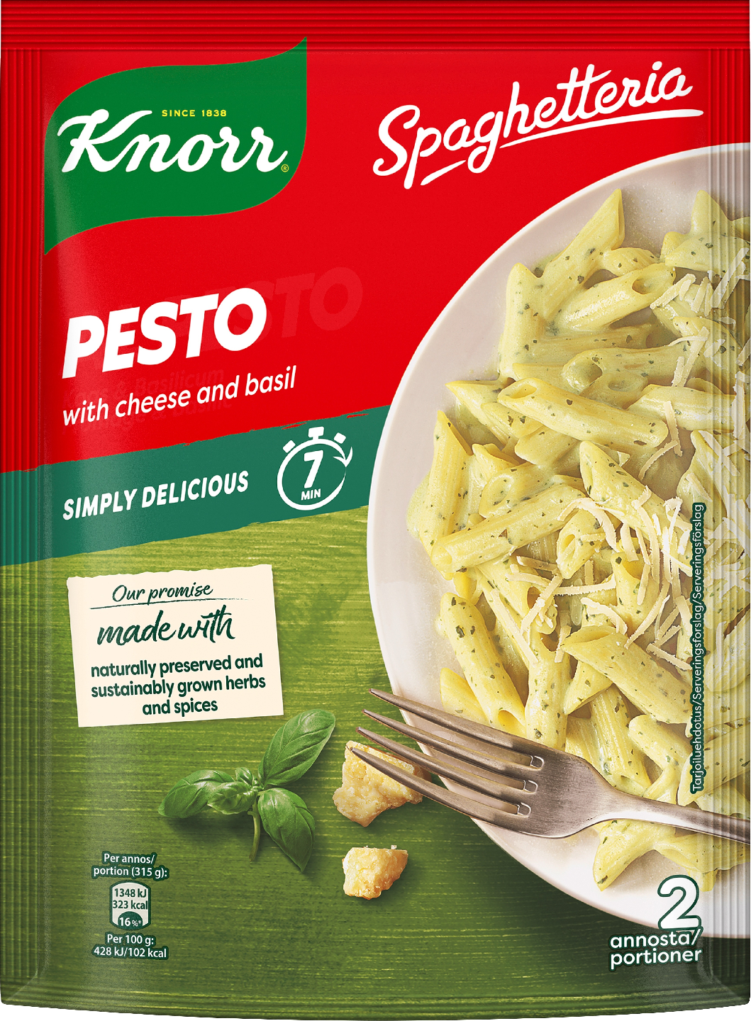 Knorr Spaghetteria Pesto on herkullinen pastaruoka, josta valmistuu helposti ja nopeasti maukas lounas tai päivällinen. Valmistus käy käden käänteessä ja vie vain 7 minuuttia! Knorr Spaghetteria Pesto on täydellinen valinta arjen kiireisiin – hyvää makua unohtamatta! Valmistus: Mittaa 5 dl vettä kattilaan, kiehauta vesi. Lisää pussin sisältö ja sekoita tasaiseksi. Anna kiehua hiljalleen koko ajan sekoittaen ilman kantta n. 7 minuuttia tai kunnes ruoan koostumus on sopiva. Nopeasti valmista ja herkullista! Kätevä Knorr Spaghetteria -valmisruoka on valmistettu laadukkaista ainesosista. Se ei sisällä säilöntäaineita ja siinä on ihastuttava kermainen rakenne. Knorr Spaghetteria Pesto -aterian ansiosta herkullinen pasta on aina valmista nautittavaksi vain muutamassa minuutissa – yksin tai yhdessä. Jokaisesta pakkauksesta valmistuu kaksi annosta. Pasta-ateriavalikoimastamme löytyy vaihtoehtoja jokaiseen makuun. Kokeile ja ihastu upeisiin makuvaihtoehtoihimme: Spaghetteria Carbonara, Spaghetteria Spinaci ja Tomato Mozzarella. Herkullisia vaihtoehtoja kaikki – valinta on sinun! Laadukas ja maukas ruoka on intohimomme Knorrilla! Siksi me pyrimme aina kehittämään uusia jännittäviä ruokatuotteita, jotka tekevät ruokailukokemuksestasi erityisen maistuvan. Yksi vahvimmista puolistamme on laaja tuntemus paikallisista ruokaperinteistä – vaikka olemmekin suuri kansainvälinen brändi. Meitä ohjaa rakkaus ruokaan. Haluamme auttaa sinua valmistamaan hyvää, yksinkertaista ja terveellistä ruokaa, jossa on runsaasti makua. Juuri intohimomme laadukkaaseen ja maukkaaseen ruokaan vie meidät tulevaisuuteen, joka huomioi paremmin yhteiskuntamme ja ympäristömme. Tulevaisuuteen, jossa kaikki raaka-aineemme vihanneksista alkaen ovat kestävästi tuotettuja. Me Knorrilla haluamme uudistaa ruokailutottumuksia, mutta emme voi tehdä sitä yksin. Rakennetaan yhdessä vihreämpää tulevaisuutta. Vieraile verkkosivuillamme knorr.com/fi ja näe tuotteemme ja reseptimme. Tutustu kaikkeen siihen, mikä meitä inspiroi kestävän tulevaisuuden luomiseen!