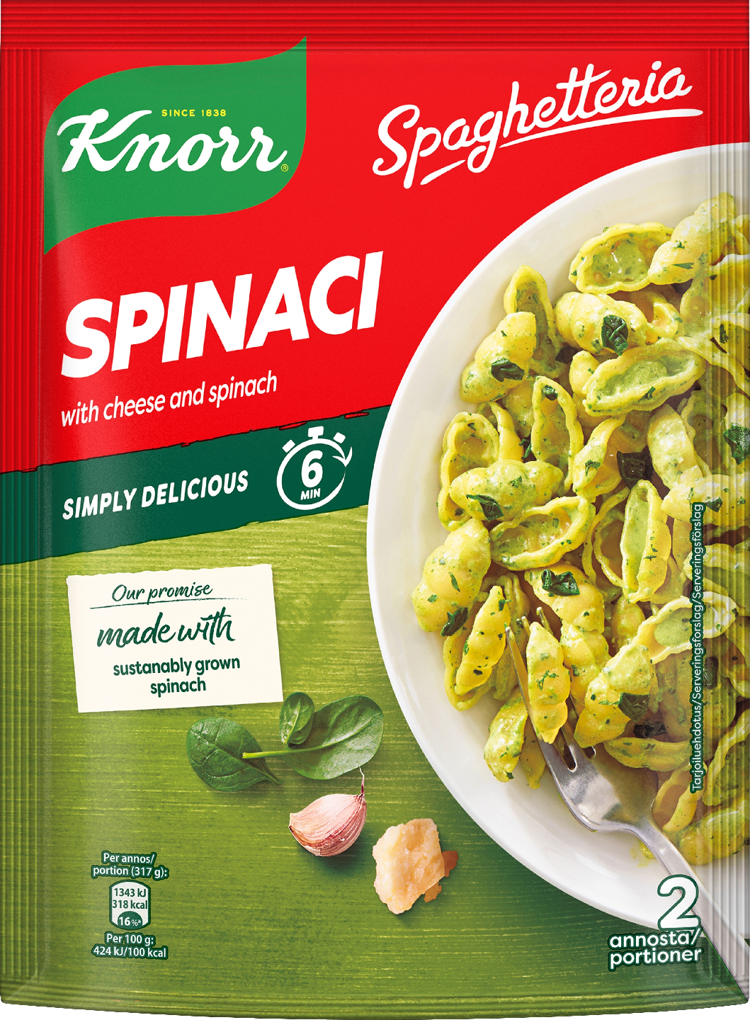 Ainesosat: Pasta 78 % (DURUMVEHNÄJAUHO), JUUSTOJAUHE 4,8 % (JUUSTO herajauhe (MAITO), riisijauho, KERMAJAUHE 3,1 %, pinaatti 1,9 %, jodioitu suola, auringonkukkaöljy, sipuli, sokeri, kaliumkloridi, aromit (sis. MAITOA) hiivauute, mausteet (mm. valkosipuli), MAITOSOKERI, palmurasva, suola MAITOPROTEIINI. Saattaa sisältää RUISTA, OHRAA, KAURAA, KANANMUNAA SOUJAA, SELLERIÄ ja SINAPPIA.