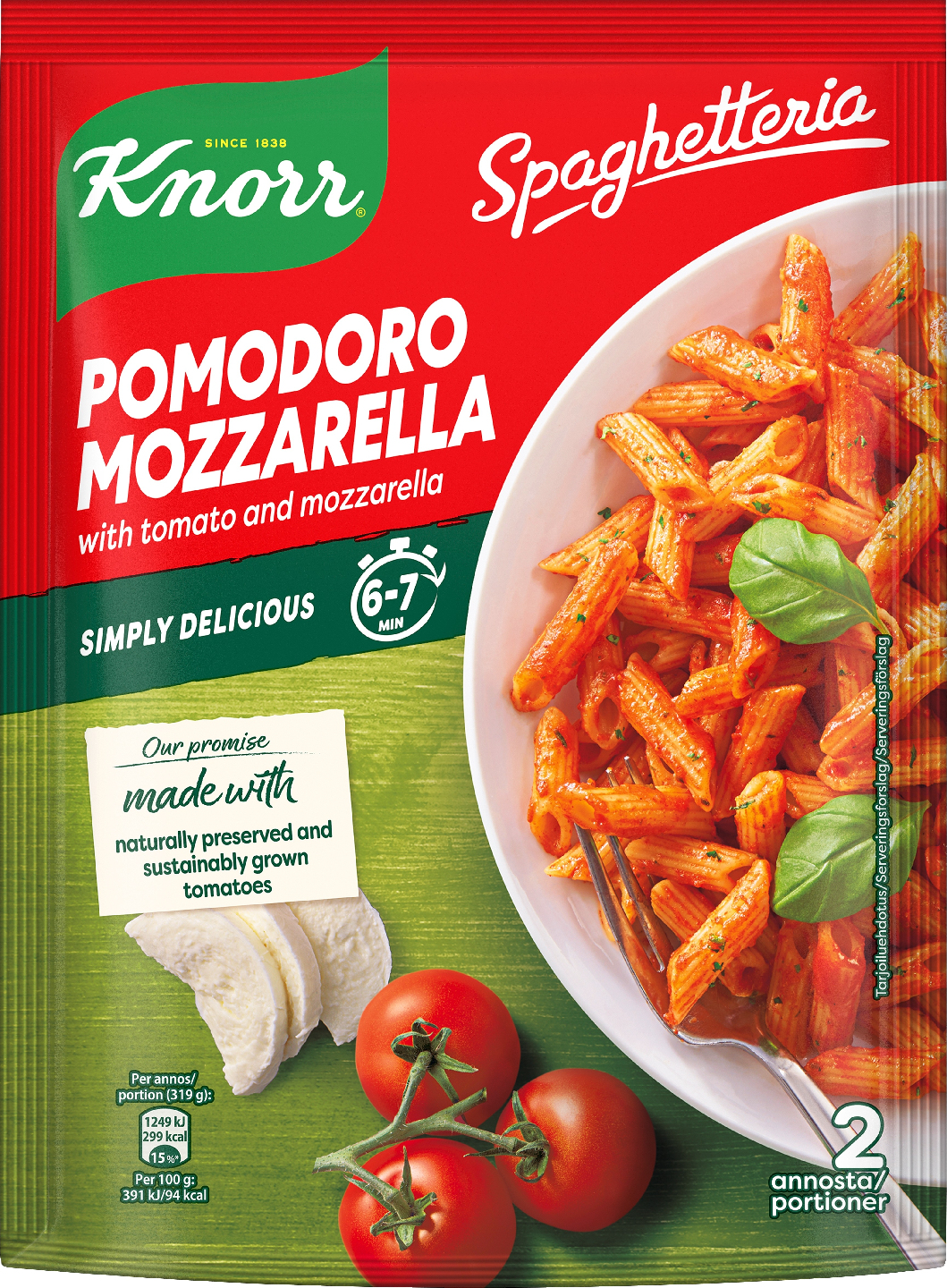 Tuulahdus italialaisen keittiön herkkuja tuo jokaiseen päivään säväyksen ekstraa. Knorr Spaghetteria Tomato Mozzarella -aterian ansiosta olet aina vain hetken päässä herkullisesta päivällisestä tai lounaasta – ruoka on valmista jo 7 minuutissa! Knorr Spaghetteria Tomato Mozzarella on käden käänteessä valmistuva helppo ja maukas pasta-ateria, joka sisältää tomaattikastiketta ja mozzarellajuustoa. Spaghetteria Tomato Mozzarella on täydellinen tomaattipasta kiireiseen arkeen, mausta tinkimättä. Näin se valmistuu: Lisää pasta-ainekset ja vesi kattilaan, odota seitsemän minuuttia välillä sekoittaen. Pakkauksesta saat herkullisen aterian kahdelle. Vaivattomasti valmistuva pasta sopii täydellisesti yksinkertaiseksi arkiruoaksi. Knorrin tomaattinen juustopasta on kätevä vaihtoehto myös silloin, kun sinun pitää valmistaa nälkäiselle nuorelle nopea ateria. Pasta-ateriavalikoimastamme löytyy vaihtoehtoja jokaiseen makuun. Kokeile ja ihastu upeisiin makuvaihtoehtoihimme – valinta on sinun. Laadukas ja maukas ruoka on intohimomme. Olemme Knorrilla sitä mieltä, että myös yksinkertaisen ja nopeasti valmistuvan ruoan tulee maistua hyvältä. Pyrimme kehittämään jatkuvasti uusia jännittäviä ruokatuotteita, jotka tekevät ruokailukokemuksestasi erityisen maistuvan. Yksi vahvimmista puolistamme on laaja tuntemus paikallisista ruokaperinteistä. Meitä ohjaa rakkaus ruokaan. Haluamme auttaa sinua valmistamaan hyvää, yksinkertaista ja terveellistä ruokaa, jossa on runsaasti makua. Juuri intohimomme laadukkaaseen ja maukkaaseen ruokaan on johtotähtemme. Se vie meidät tulevaisuuteen, joka huomioi paremmin yhteiskuntamme ja ympäristömme. Tulevaisuuteen, jossa kaikki raaka-aineemme vihanneksista alkaen ovat kestävästi tuotettuja. Me Knorrilla haluamme uudistaa ruokailutottumuksia, mutta emme voi tehdä sitä yksin. Siksi kutsumme sinut mukaan. Rakennetaan yhdessä vihreämpää tulevaisuutta. Vieraile verkkosivuillamme knorr.com/fi nähdäksesi tuotteemme ja reseptimme. Tutustu kaikkeen siihen, mikä meitä inspiroi kestävän tulevaisuuden luomiseen.