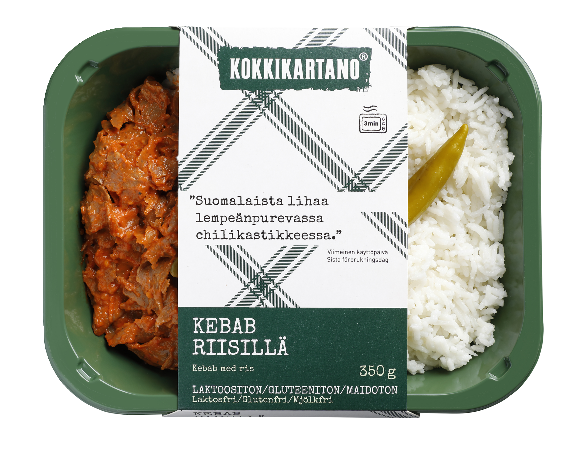 LaktoositonTätä Suomen epävirallista kansallisruokaa on saatavilla Kokkikartanon kääreessä. Runsas annos Snellmanin kotimaista kebablihaa ja meidän makuun oikein hyvää kastiketta. Lisukkeena ei mitä tahansa riisiä, vaan basmatiriisiä. Mukaan ripaus tulisuutta jalapenoista.