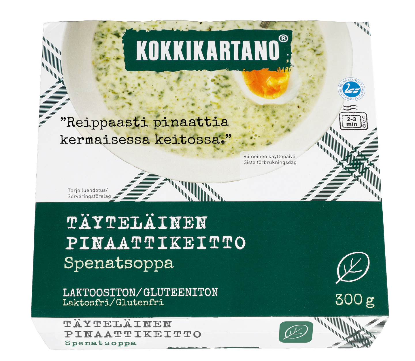 LaktoositonKokkikartanon keittoperheen kestosuosikki, jossa on luonnollisesti paljon pinaattia ja suomalaista kermaa. Kokeile pinaattikeittoa myös kalan kastikkeena.