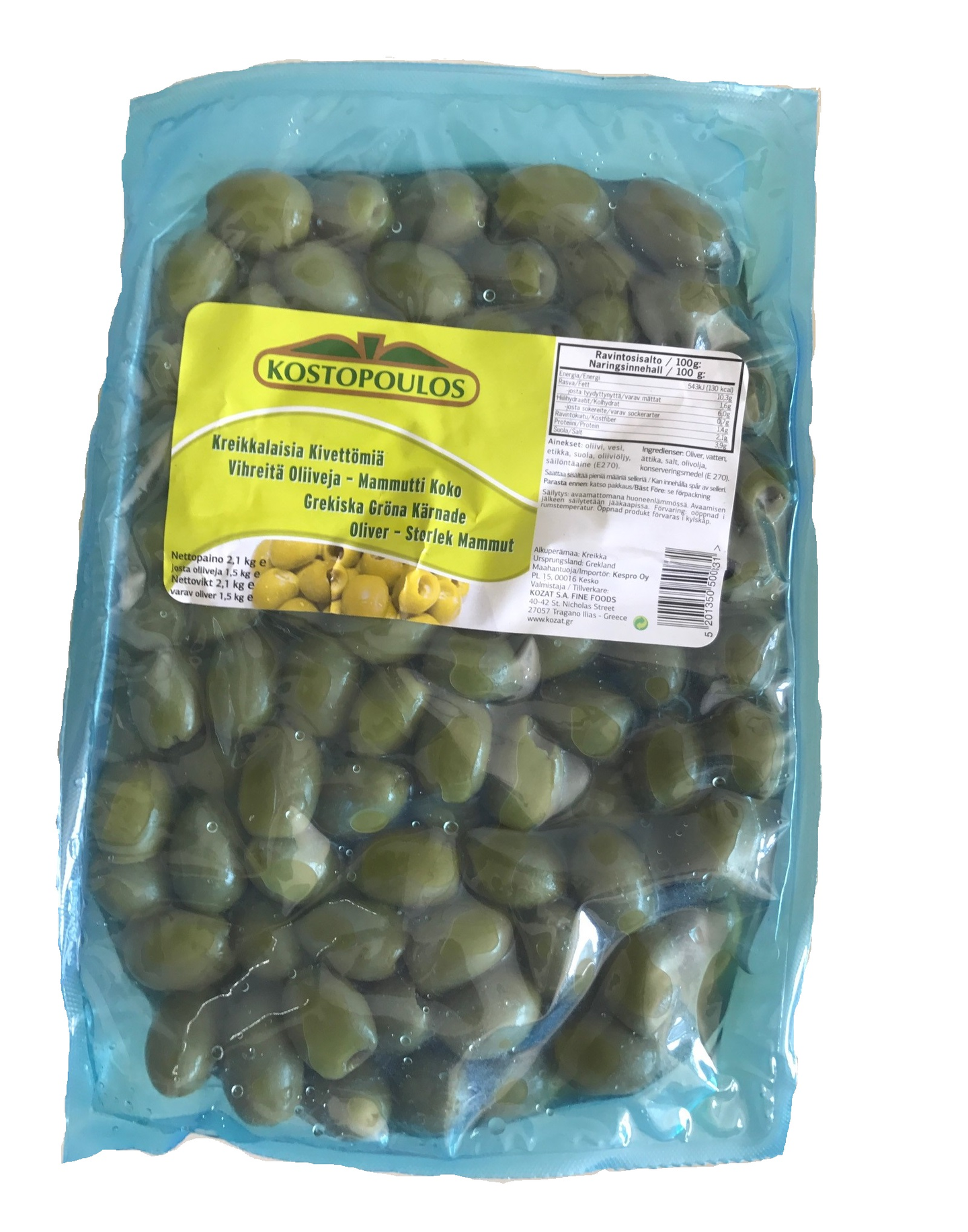 Kostopoulos kreikkalaisia kivettömiä vihreitä oliiveja mammuttikoko 2,1kg/1,5kg pussi