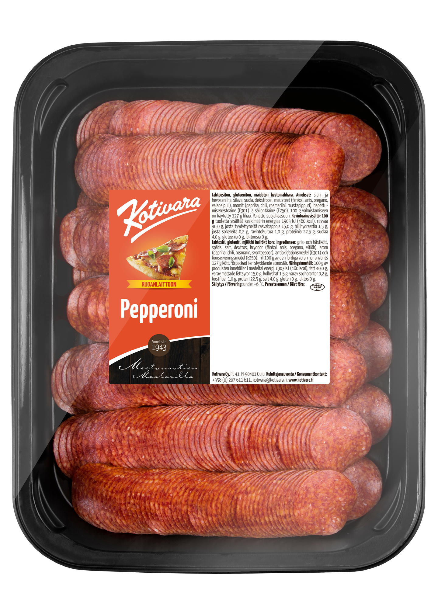 MaidotonPaljon toivottu Kotivaran Pepperoni on saatavana myös suurkeittiö-pakkauksessa. Voimakkaasti maustettu ja huolella kypsytetty herkullinen maku sopii niin pizzoihin kuin muuhunkin ruoanlaittoon. Laktoositon, gluteeniton, maidoton.