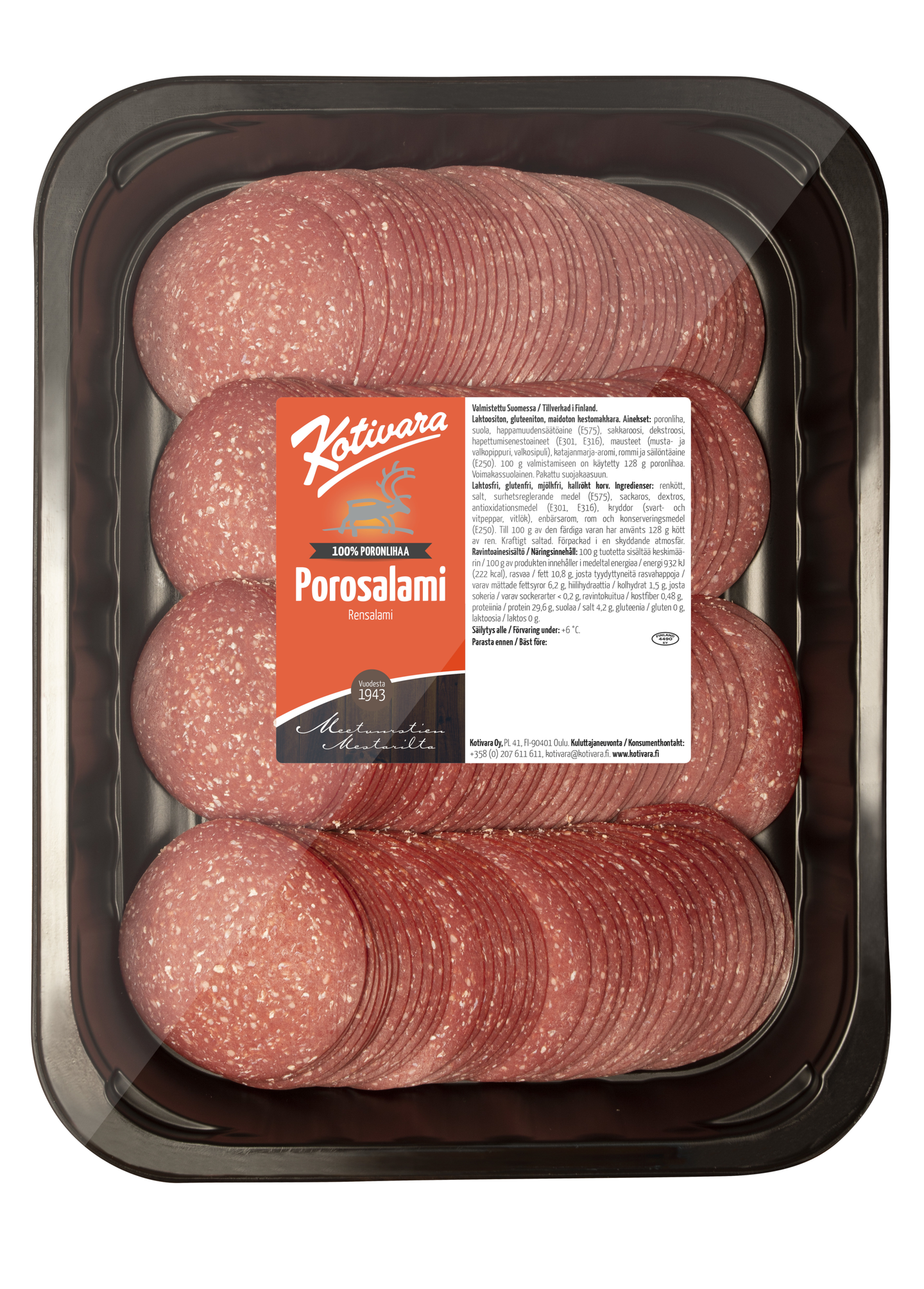 poronliha (Suomi), suola, sokeri, dekstroosi, maltodekstriini, hapettumisenestoaineet (E301, E316), mausteuutteet (valkosipuli, katajanmarja, pippuri), rommi, säilöntäaine (E250)