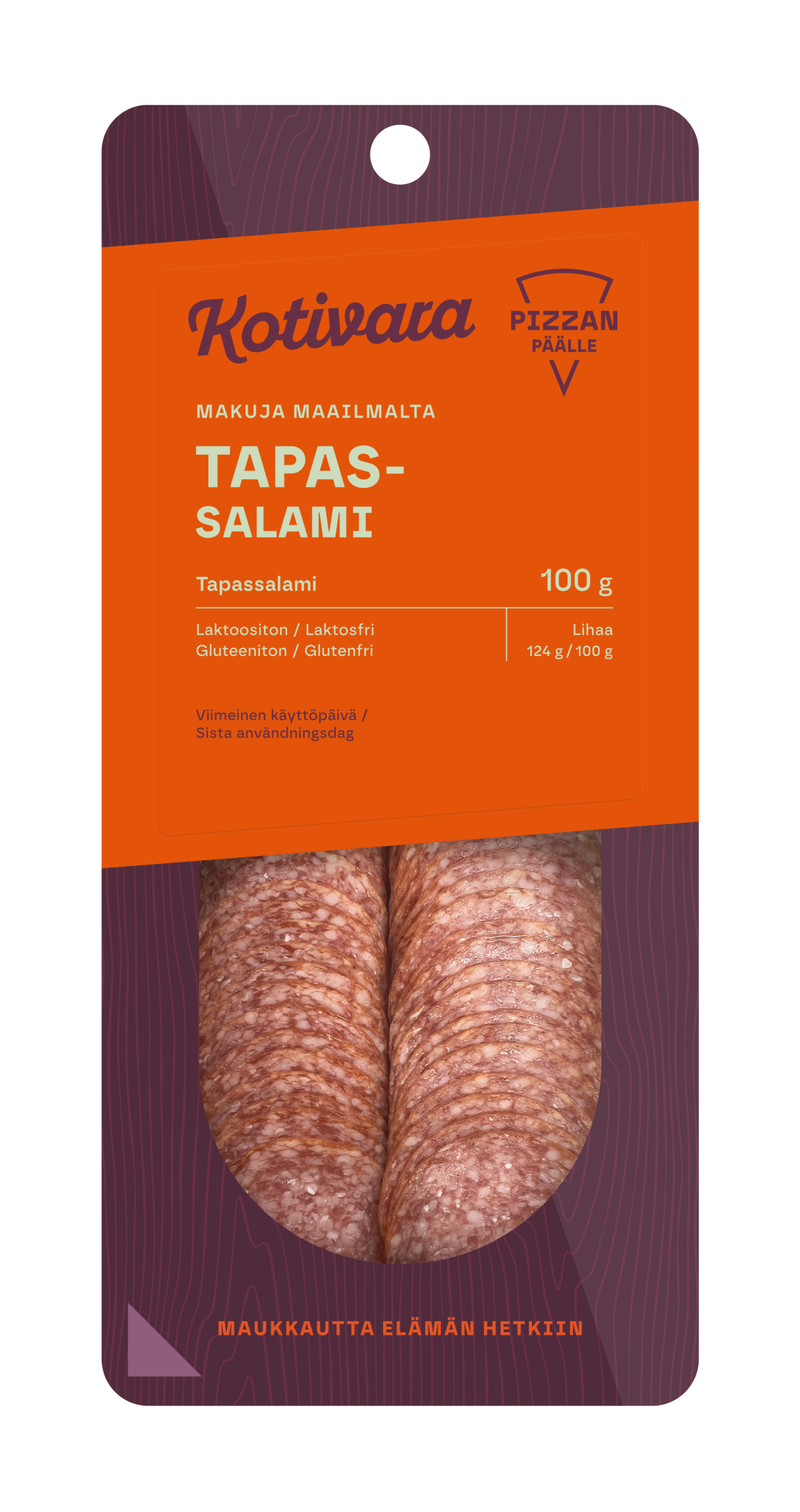 LaktoositonAika espanjalainen. Kotivaran Tapassalami on espanjalaistyyppinen napostelusalami, jossa maistuvat Välimeren alueen maut. Tapassalami sopii syötäväksi sellaisenaan tai tuomaan makua salaatteihin, keittoihin, pizzoihin ja suolaisiin leivonnaisiin. Tapassalamin siivut ovat pakkauksessa kahdessa runsaassa viuhkassa. On aika kokeilla jotain uutta.