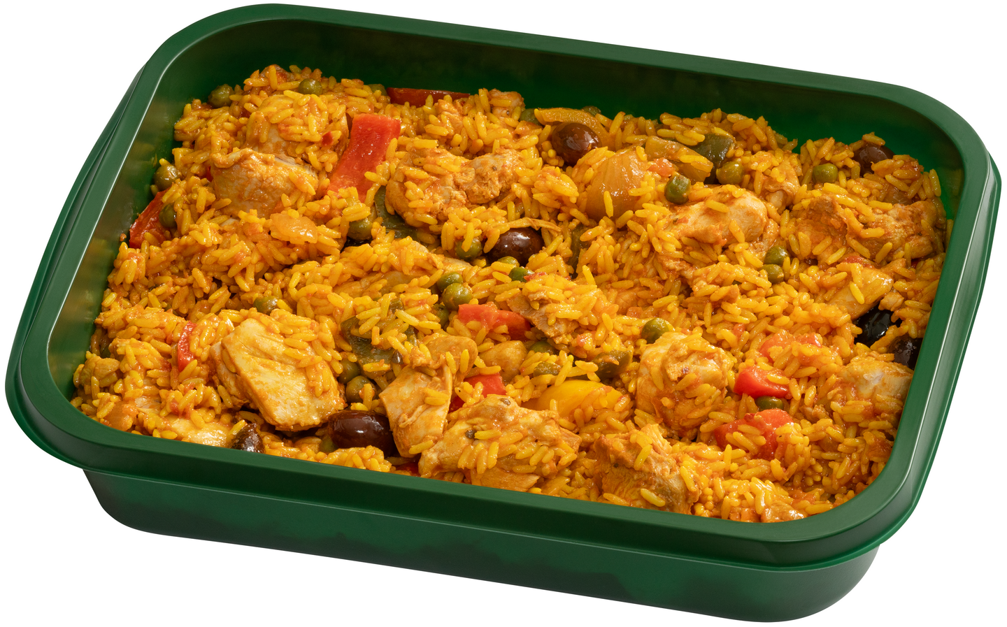 Kypsennetty riisi 42% (riisi (eu), vesi), broileri 19% (broilerin liha (Suomi), vesi, rypsiöljy, riisitärkkelys, jodioitu suola, glukoosi)), tomaattikastike (tomaatti, suola), paprika, herne, sipuli, oliivi (kalamon-oliivi, viinietikka, suola), kanaliemi (suola, maltodekstriini, aromit, hiivauute, kananlihajauhe, kananrasva, sipulijauhe, sipulimehutiiviste, sokeri, mauste, auringonkukkaöljy), sitruunatäysmehu (tiivisteestä, sis. SULFIITTI), valkosipulimurska (valkosipuli, vesi, sokeri, valkoviinietikka, sitruunahappo, säilöntäaine (E211)), sitruunankuori, kurkuma, chilirouhe. Gluteeniton, maidoton.