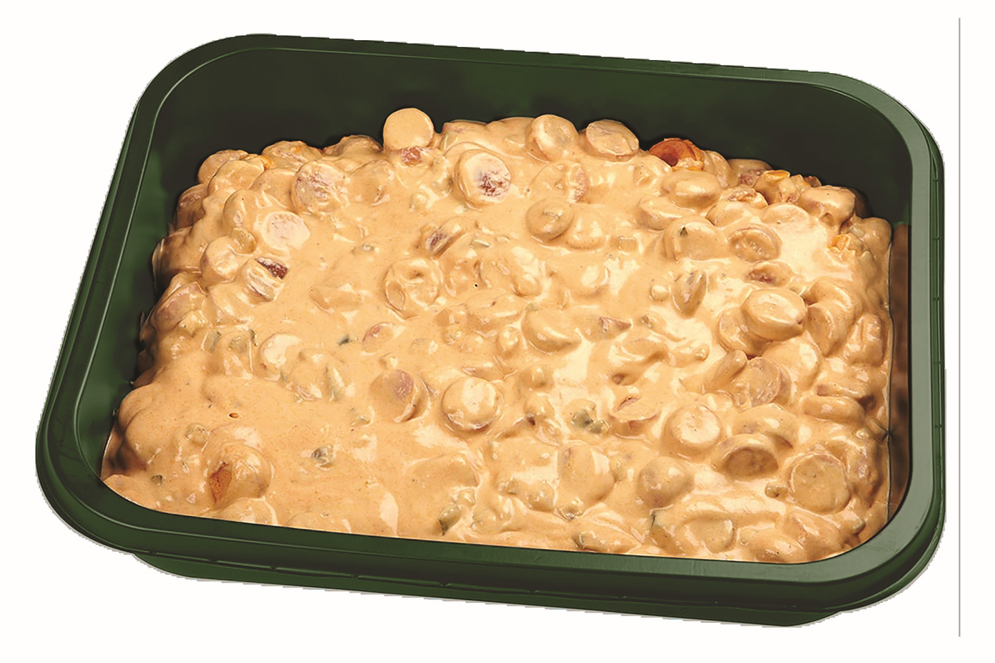 Nakki 39% (broilerin, kalkkunan-, naudan ja sianliha (Suomi), vesi, kamara, perunajauho, stabilointiaineet (E450), jodioitu suola, lihaproteiini, maltodekstriini, perunakuitu, dekstroosi, mausteet (mm. korianteri, kurkuma, paprika, kumina, inkivääri, kardemumma, valkosipuli, valkopippuri, mustapippuri), aromit (mm. chili, neilikka, savu), säilöntäaine (E250)), laktoositon KERMA, sipuli, maustekurkku (kurkku, etikka, sokeri, säilöntäaine (E211, E202), luontaiset aromit (mm. SINAPINSIEMEN), sakariini)), tomaattipyree, muunnettu maissitärkkelys, lihaliemi (suola, rypälesokeri, maissijauho, maltodekstriini, hiivauute, paahdettu sipuli, poltettu sokeri, valkosipuli, liha-aromi, kasvirasvavalmiste (kookos, herneproteiini)), valkopippuri. Voimakassuolainen. Laktoositon, gluteeniton.