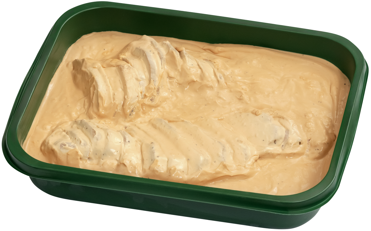 Porsaanliha 50% (porsaan sisäfilee (Suomi), vesi, suola)), kastike 50% (vesi, laktoositon KERMA, kasvirasva (palmu, kookos), maltodekstriini, rypsiöljy, suola, aromi, muunnettu maissitärkkelys, sipuli, naudanlihauute, väri (E150c), paprikajauhe, valkosipuli, sokeri, valkopippuri)), SINAPPI, hunaja, maissitärkkelys, lihaliemi (suola, rypälesokeri, maissijauho, maltodekstriini, hiivauute, paahdettu sipuli, poltettu sokeri, valkosipuli, liha-aromi, kasvirasvavalmiste (kookos, herneproteiini), mustapippuri)). Laktoositon, gluteeniton.